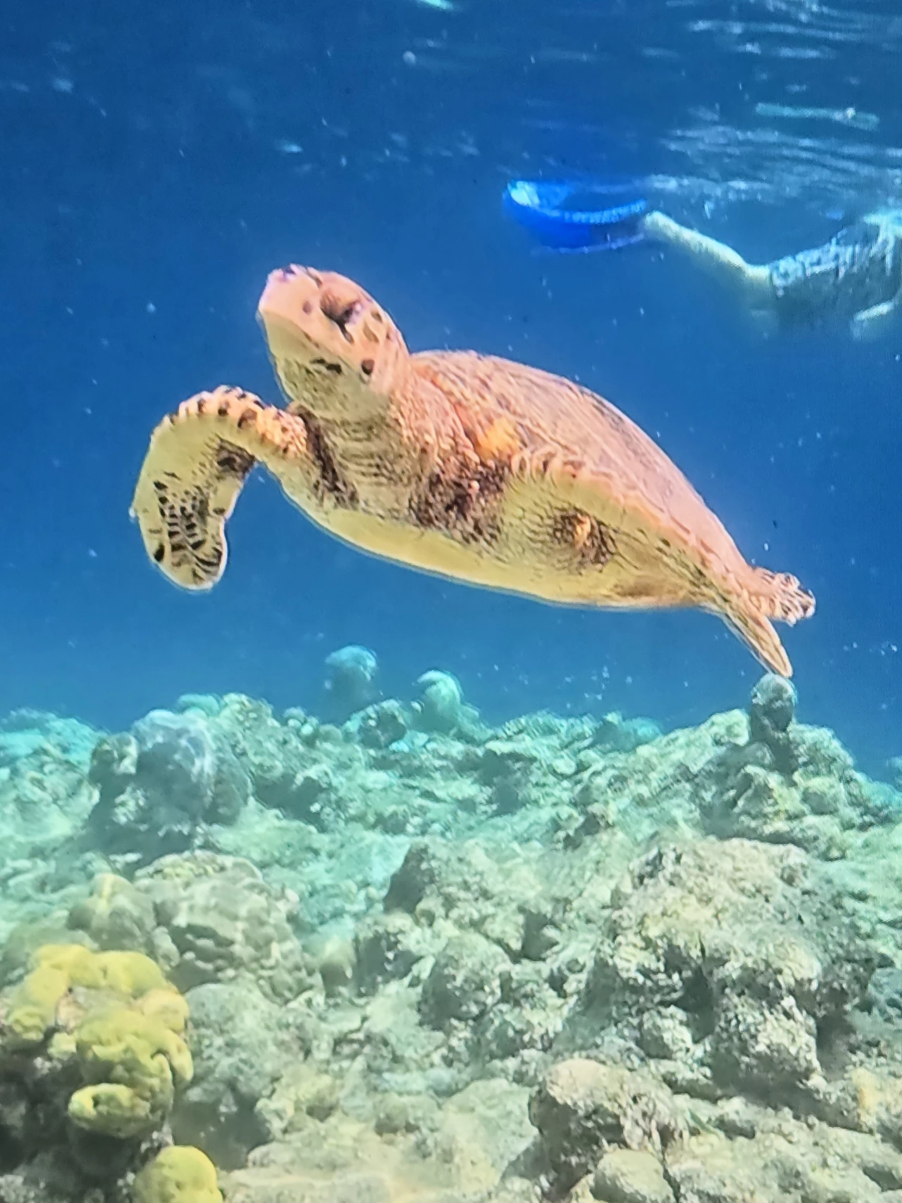 We made full use of the complimentary snorkel and mask hire, spending hours exploring the vibrant reef just off the shore — so many colourful fish! The absolute highlight of the trip, though, was the “Swim with Turtles” excursion. Gliding alongside these graceful creatures in their natural habitat was truly unforgettable.