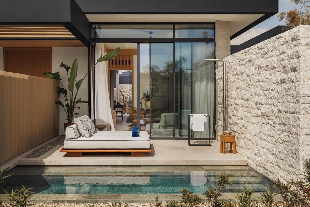 Each morning, I woke to the soft sound of waves and sunlight pouring through the floor‑to‑ceiling windows of my bungalow. The design was stunning—natural textures, warm stone, rattan accents, and a subtle 1960s glamour that made the space feel both nostalgic and contemporary. Many accommodations here come with private pools, outdoor showers, and firepits, and mine felt like my own secluded sanctuary.
