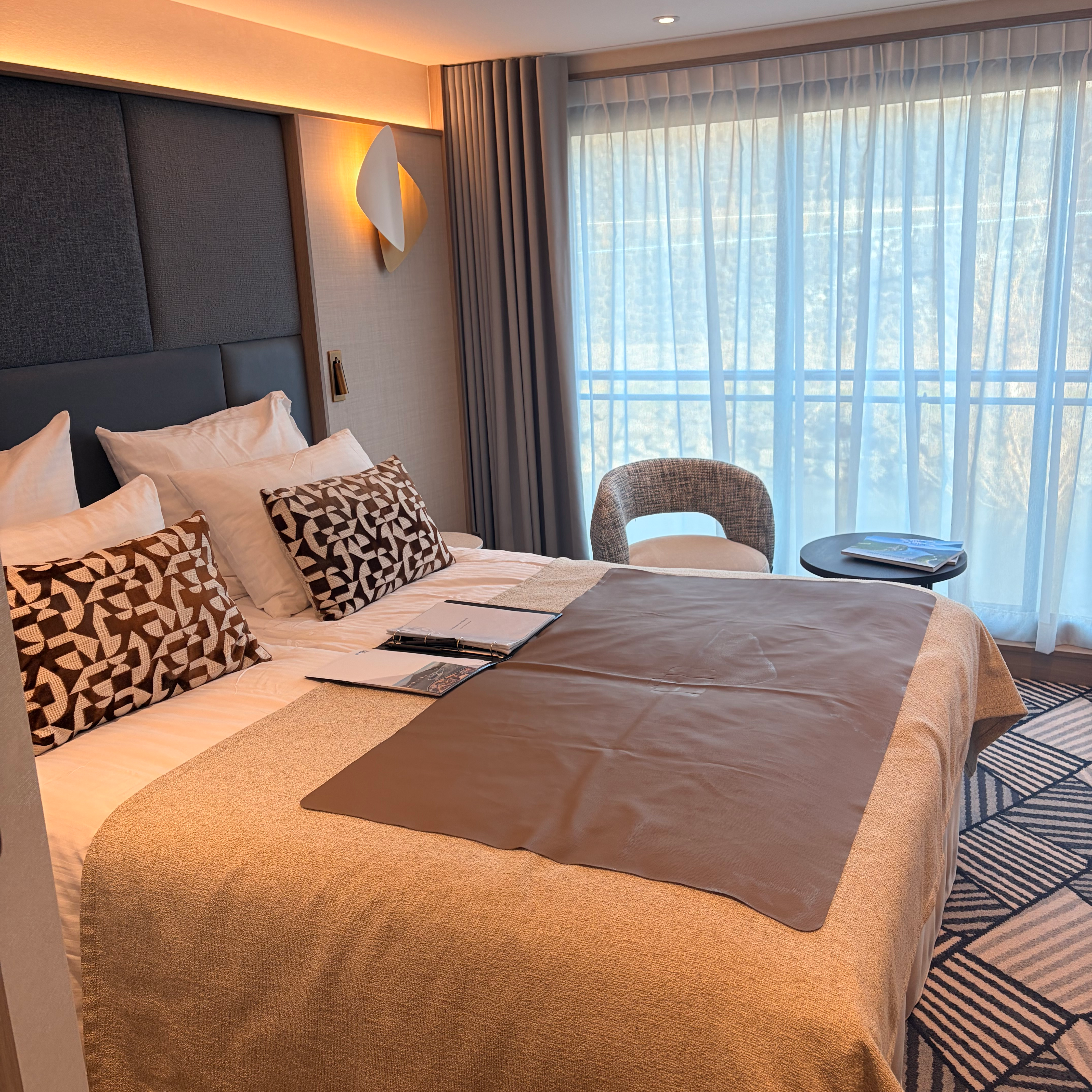 From the moment I stepped into my cabin, I felt instantly at ease. The design is modern and calming, with soft neutral tones and warm lighting that make it feel more like a boutique hotel room than a cruise cabin.