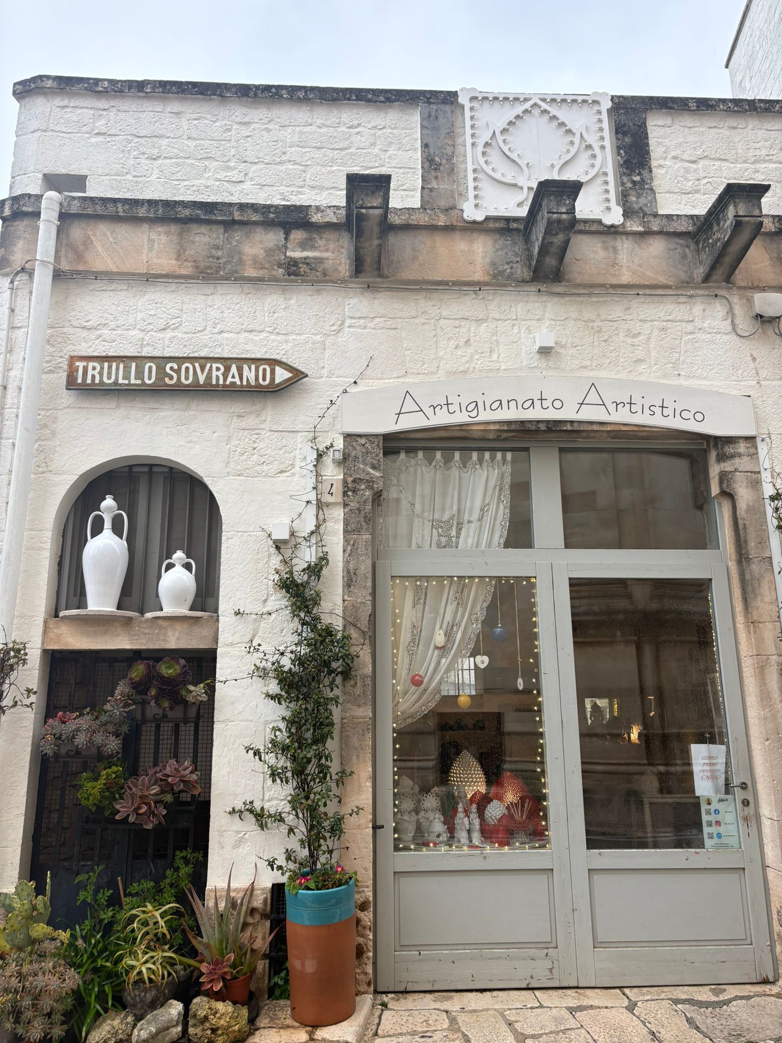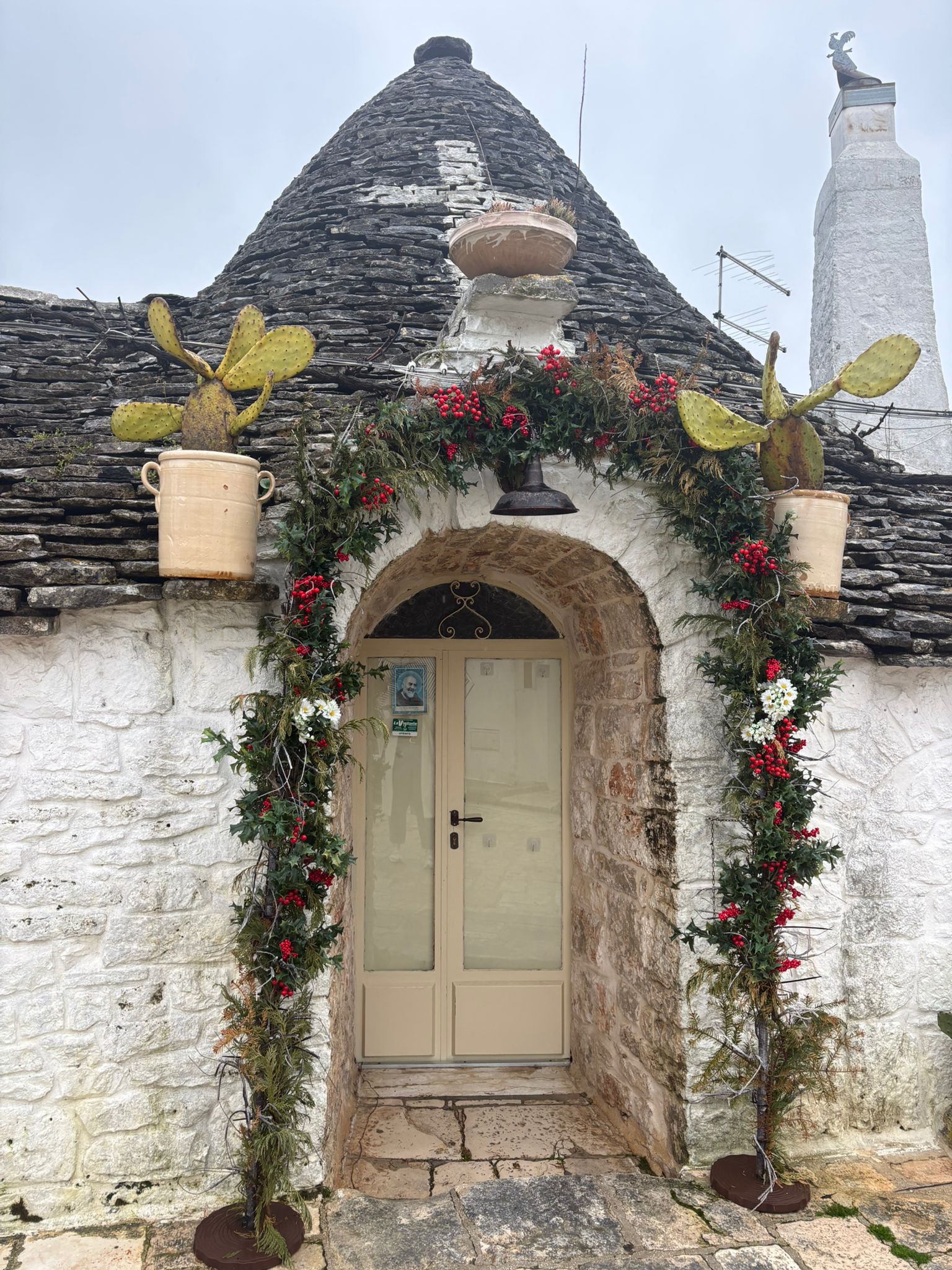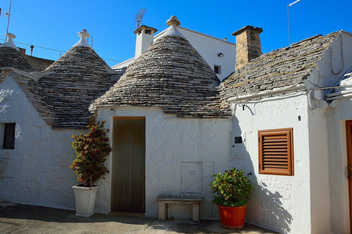 The construction of a trullo is both practical and ingenious. Builders used the abundant local limestone found in the Puglian countryside. The thick stone walls keep the interior cool during the hot Mediterranean summers and help retain warmth during the cooler winter months. The iconic cone-shaped roofs are formed by placing flat limestone slabs in gradually narrowing circles, creating a self-supporting dome. At the very top, many roofs are crowned with decorative stone pinnacles, each with its own symbolic meaning.