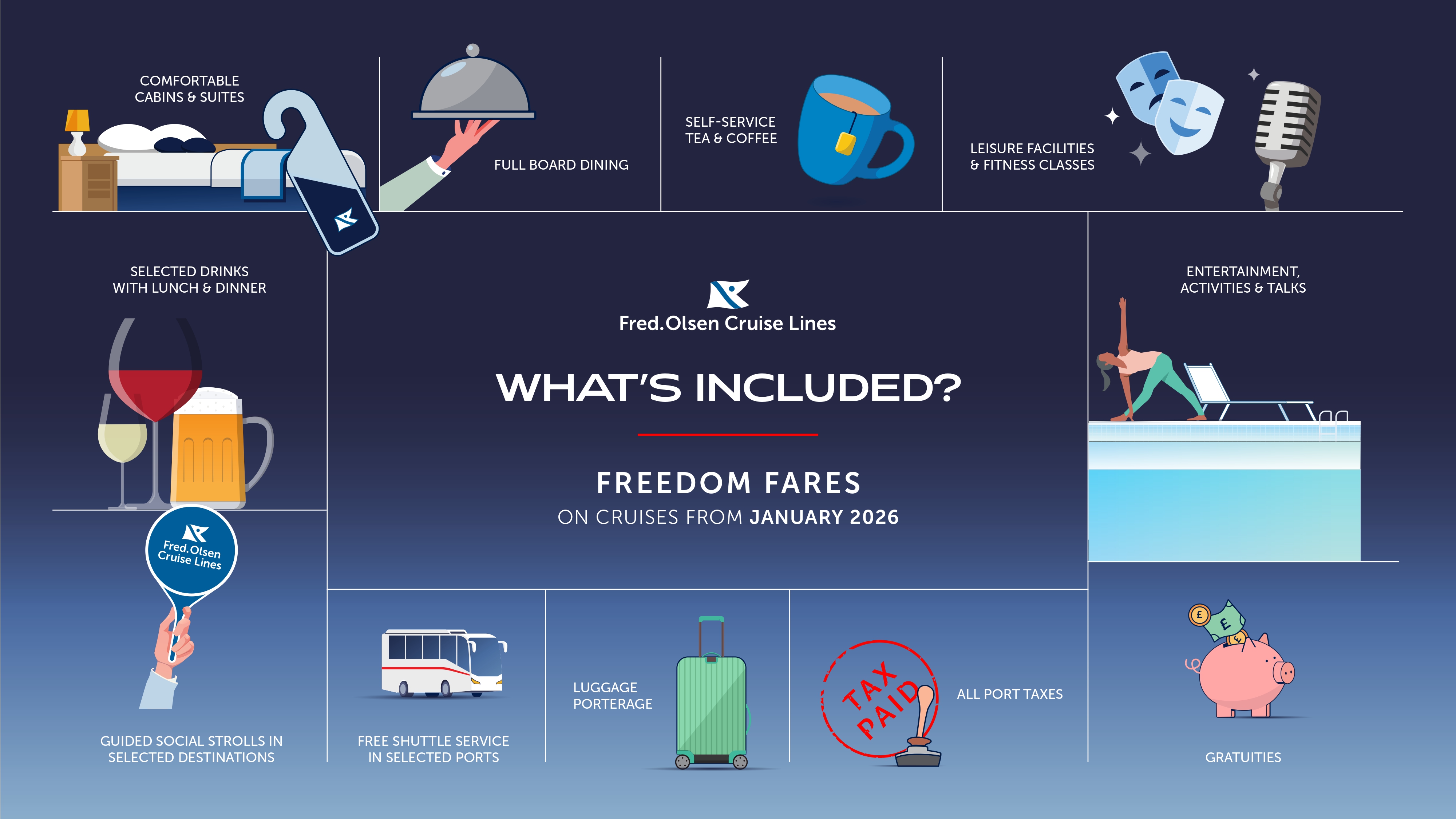 Book now to benefit from Fred. Olsen Cruise Lines' FREEDOM FARE PRICE PROMISE* If you book within the first four weeks of launch, you can take advantage of their Freedom Fare Price Promise. If your cruise price is later reduced, they will automatically upgrade you or gift you On-Board Spend, so you can rest assured that by booking early, you'll be getting the best value on Your Freedom Fare.