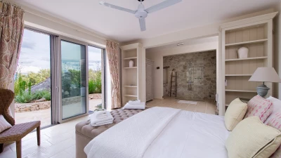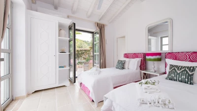 The private Kardaki Estate spreads over forty acres of olive grove slopes, at the north-eastern tip of Corfu, between popular Kassiopi and peaceful St. Spiridon. With gorgeous views down to the sea and sands of Kalamaki Bay, Acacia House is proving an enormous success. Steeped in tranquillity, its architectural design and interior décor reflect Greek island traditions, while adding 21st century facilities, and a chic and contemporary style. Terraced into the slope, the villa’s main floor is home to two en suite bedrooms, each with a private patio; and to a modern kitchen and a large living/dining room with huge glass doors to a covered terrace. With shaded lounging and dining areas and views over the Ionian Channel, the broad terrace has an exterior stairway to the lower level, where a guest suite enjoys extra privacy, opens on to the poolside and has the option of an extra child’s bed. The villa’s generous infinity pool is the focus of al fresco living. Tavernas in pretty Perithia are just 1km away.