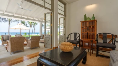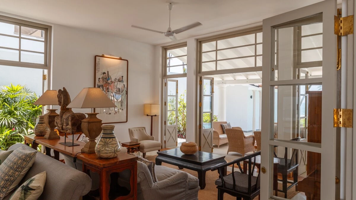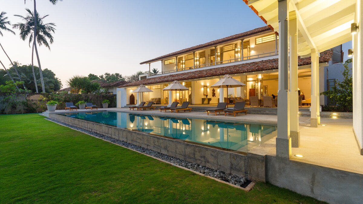 Conceived by renowned Sri Lankan architect Channa Daswatte, this beautifully appointed and spacious property is in a fantastic location overlooking the beach at Habaraduwa and just 14km from vibrant Galle. The villa centres around generous communal outdoor spaces with a leafy entrance courtyard, open-air covered dining and a large comfortable air-conditioned living room. The team include a villa manager, housekeeper and a chef to ensure that you are beautifully looked after. Each of the bedrooms enjoys blissful ocean views; a master suite features a walk-in dressing room, while all three bedrooms have super king size beds and en suite bathrooms. The outside space is stunning, with an inviting 15m pool. At the end of the garden is a gate opening onto a beautiful sandy beach.