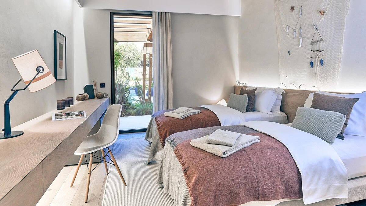 The villa offers five stylish bedrooms designed for comfort and privacy. The master suite includes a king-size bed, an en-suite bathroom, and a private mezzanine office, along with a large private terrace. Two additional bedrooms boast king-size beds and en-suite bathrooms, while bedrooms four and five share a bathroom and are fitted with twin beds and bunk beds, ideal for families or groups. Each bedroom offers direct access to patios or terraces, enhancing the seamless indoor-outdoor living experience.