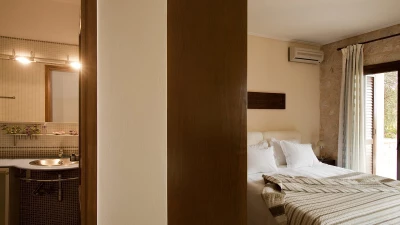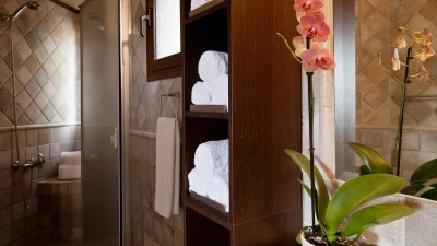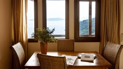 The ground floor is bright and airy, thanks to high ceilings and large windows that draw the sea and pool into view. Here, an open-plan lounge, dining and kitchen space makes the most of the outlook, with French windows opening onto the sun-soaked terraces. A bedroom with ensuite shower room also shares this level, complete with its own romantic sea-view terrace. On the lower floor, a second bedroom enjoys direct access to the gardens and another en-suite shower room, making the villa ideal for two couples or small families.