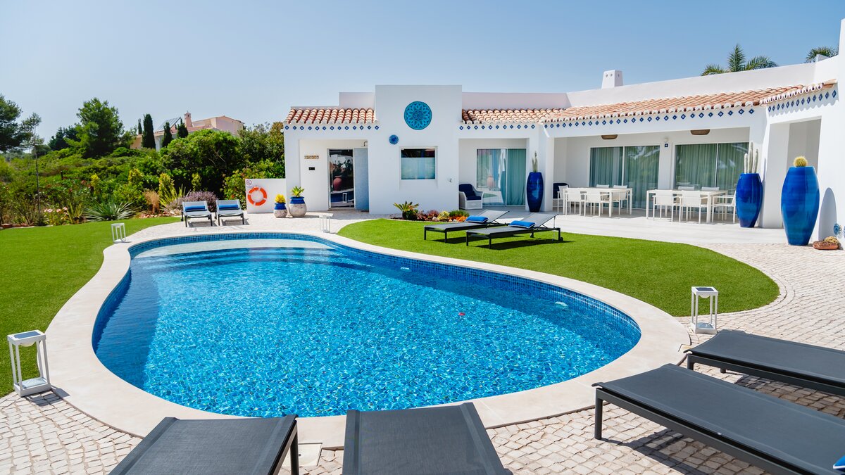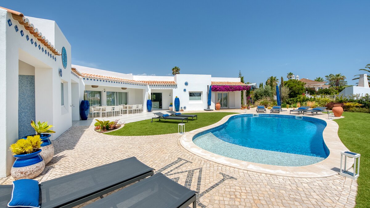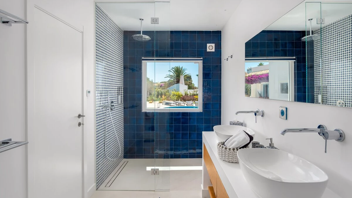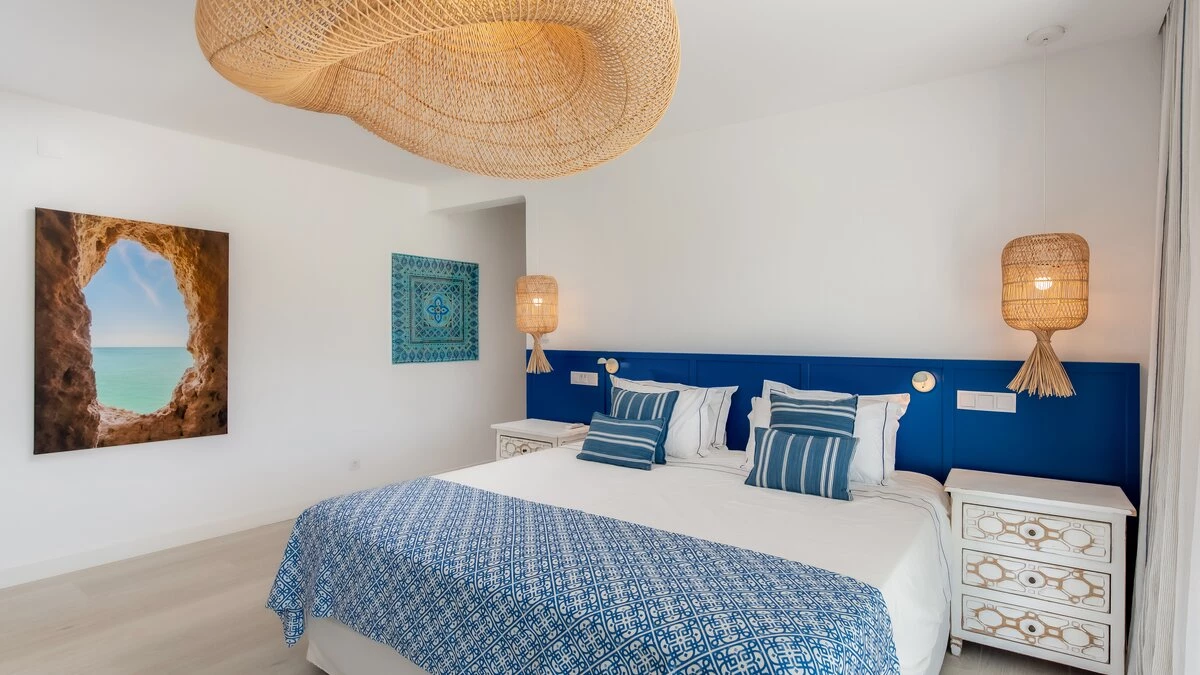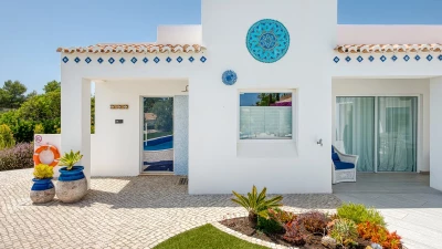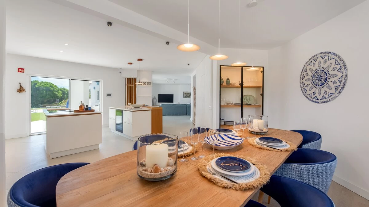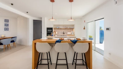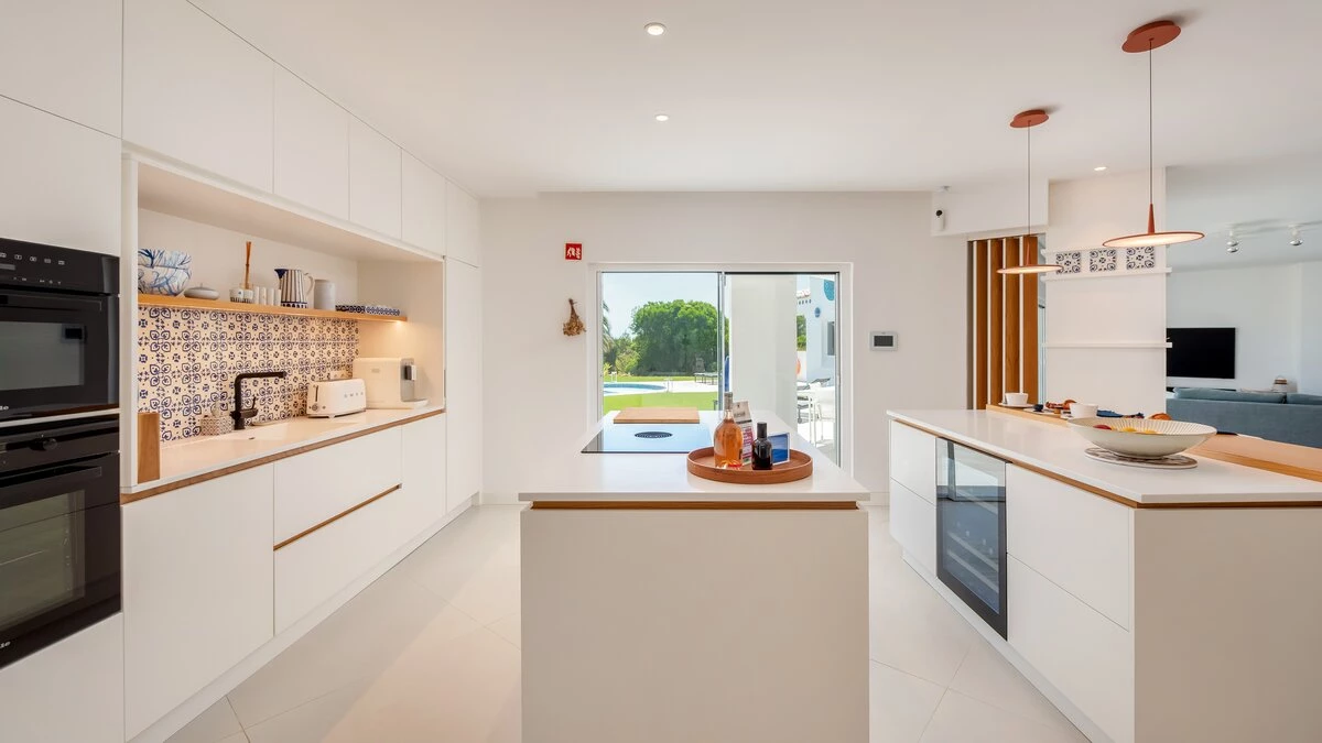 Step inside to discover spacious, light-filled interiors where natural materials and soothing tones evoke the beauty of the surrounding landscape. The villa’s double island kitchen and adjoining dining area flow seamlessly into a welcoming main lounge and a more intimate sitting room, offering both communal and private spaces. Four en-suite bedrooms; each named after local beaches (Praia Luz, Paraïso, Falesia, Rocha), are individually decorated in calming shades of blue, turquoise, and ochre, and each enjoys either sea or pool views, or a secluded patio. Carefully chosen furnishings, plush bedding, and historical Portuguese azulejos add a touch of heritage and comfort throughout, ensuring a cosy yet sophisticated ambiance.