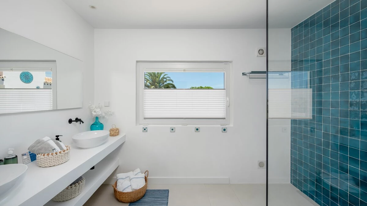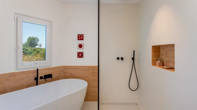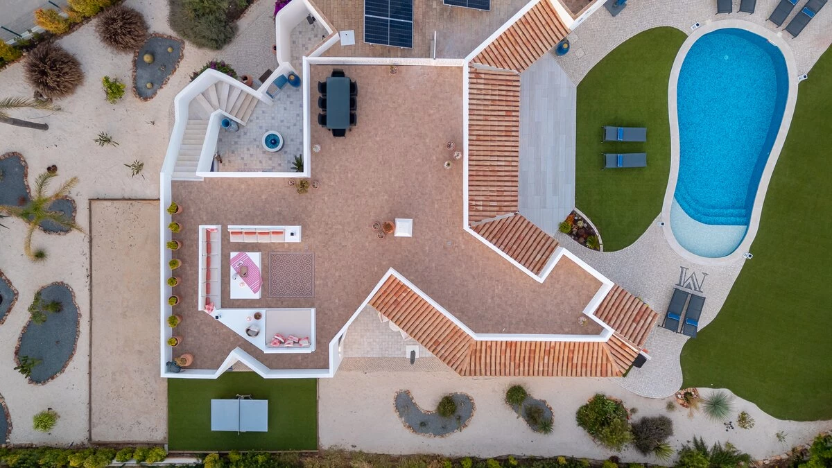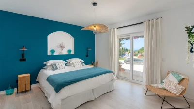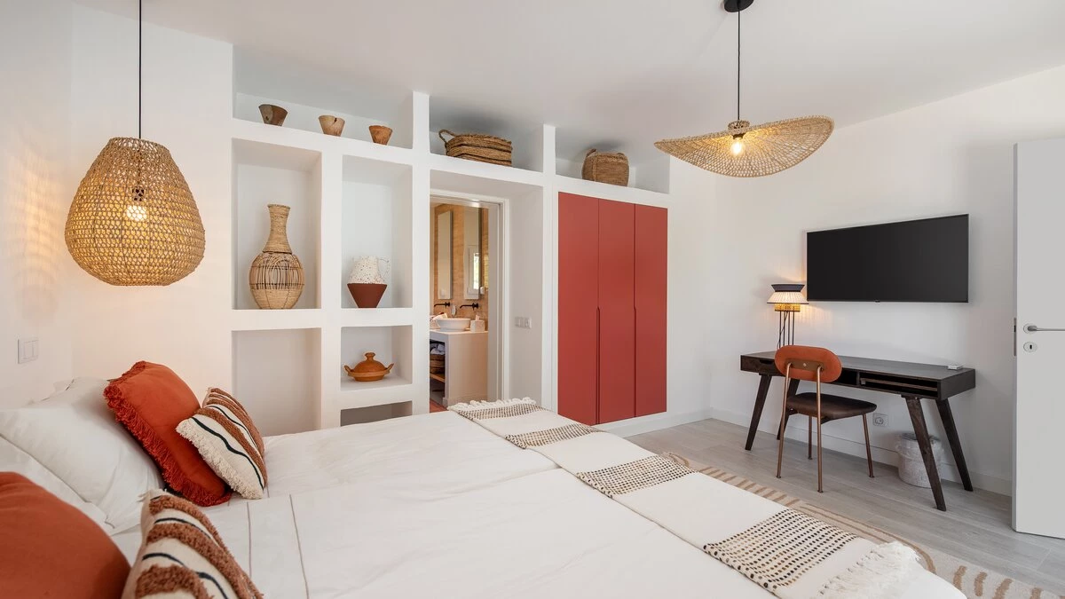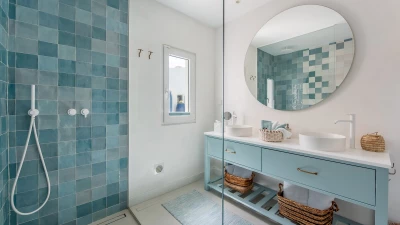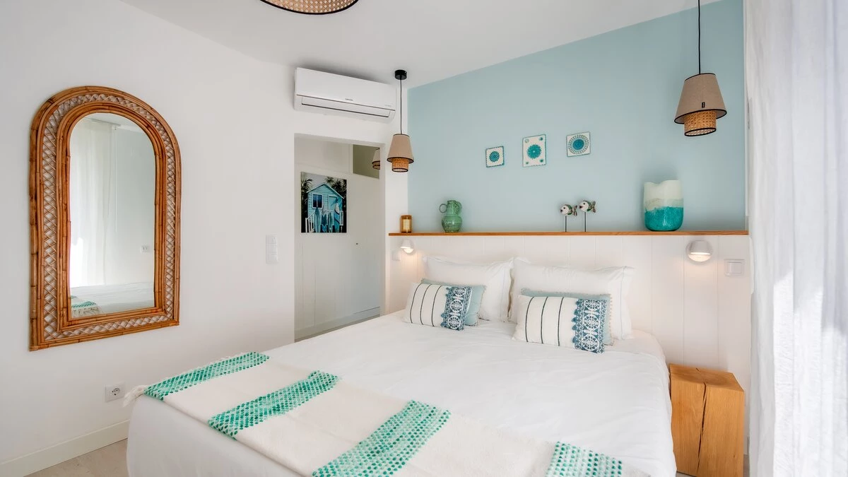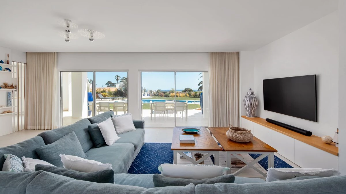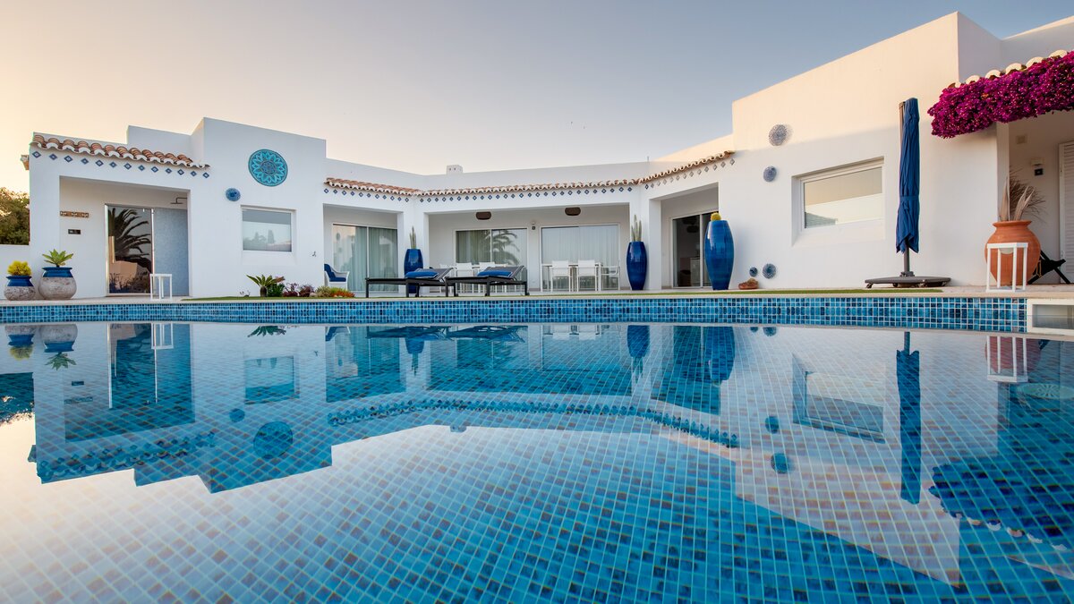 Step inside to discover spacious, light-filled interiors where natural materials and soothing tones evoke the beauty of the surrounding landscape. The villa’s double island kitchen and adjoining dining area flow seamlessly into a welcoming main lounge and a more intimate sitting room, offering both communal and private spaces. Four en-suite bedrooms; each named after local beaches (Praia Luz, Paraïso, Falesia, Rocha), are individually decorated in calming shades of blue, turquoise, and ochre, and each enjoys either sea or pool views, or a secluded patio. Carefully chosen furnishings, plush bedding, and historical Portuguese azulejos add a touch of heritage and comfort throughout, ensuring a cosy yet sophisticated ambiance.