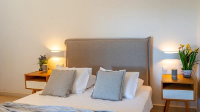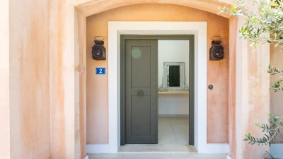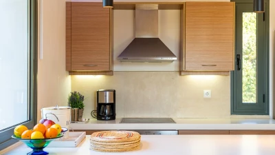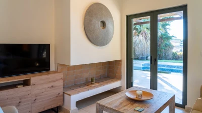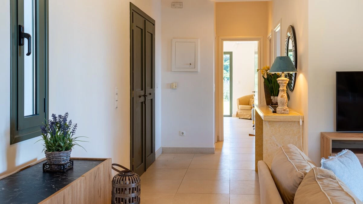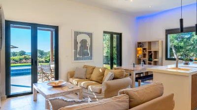 Contemporary, comfortable and quietly positioned close to the sea, this is a lovely family villa in Kefalonia. A rural retreat for a really relaxing holiday, it is equally attractive for two couples. Clean lines and cool colours add to the feeling of spaciousness in this single-storey villa, beautifully designed by its young Athenian owners, with quality fixtures and furnishings. The villa’s airy kitchen/living room opens on to a shaded veranda and al fresco dining area, and each of the three stylishly uncluttered bedrooms has direct access to the terrace or garden. South-facing and sun-drenched, the grounds are softly laid to lawn, surrounding an inviting swimming pool, and gazing out over a green valley to the sea and offshore islet of Dias.