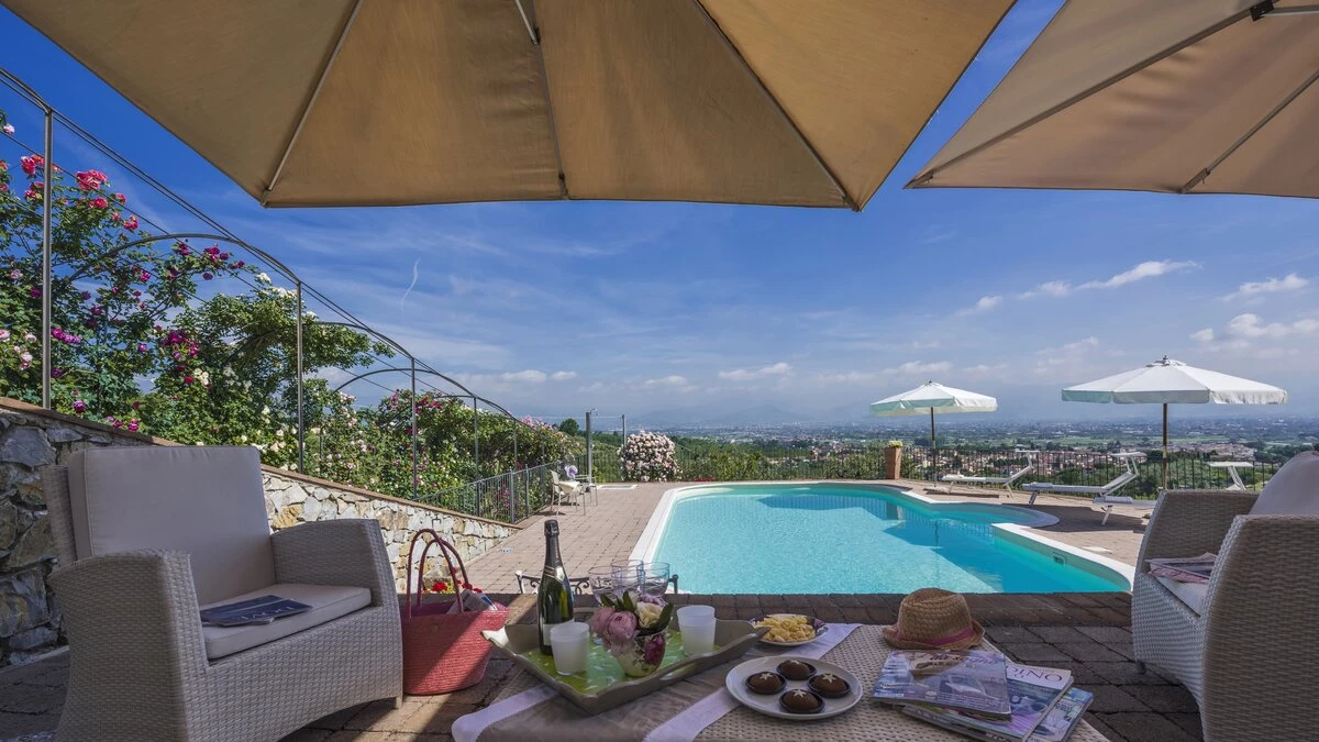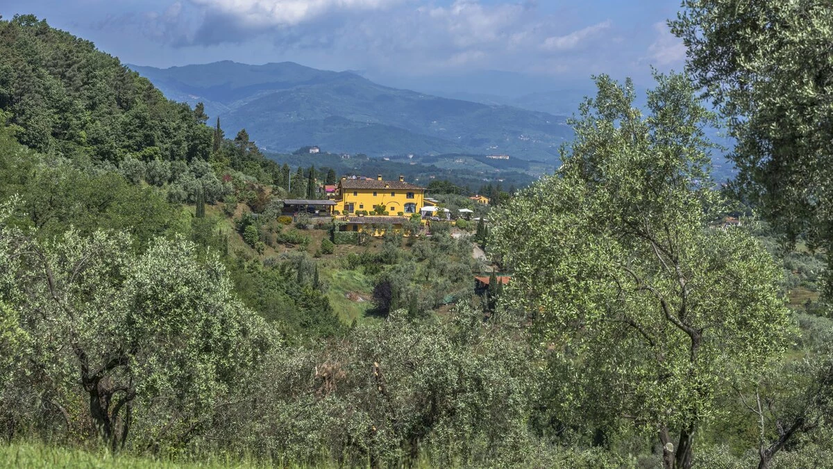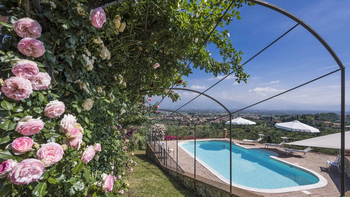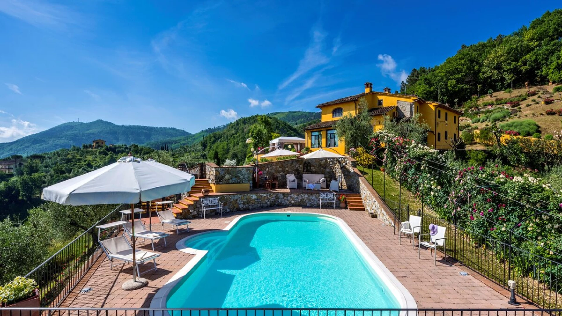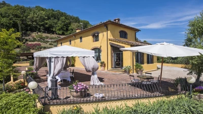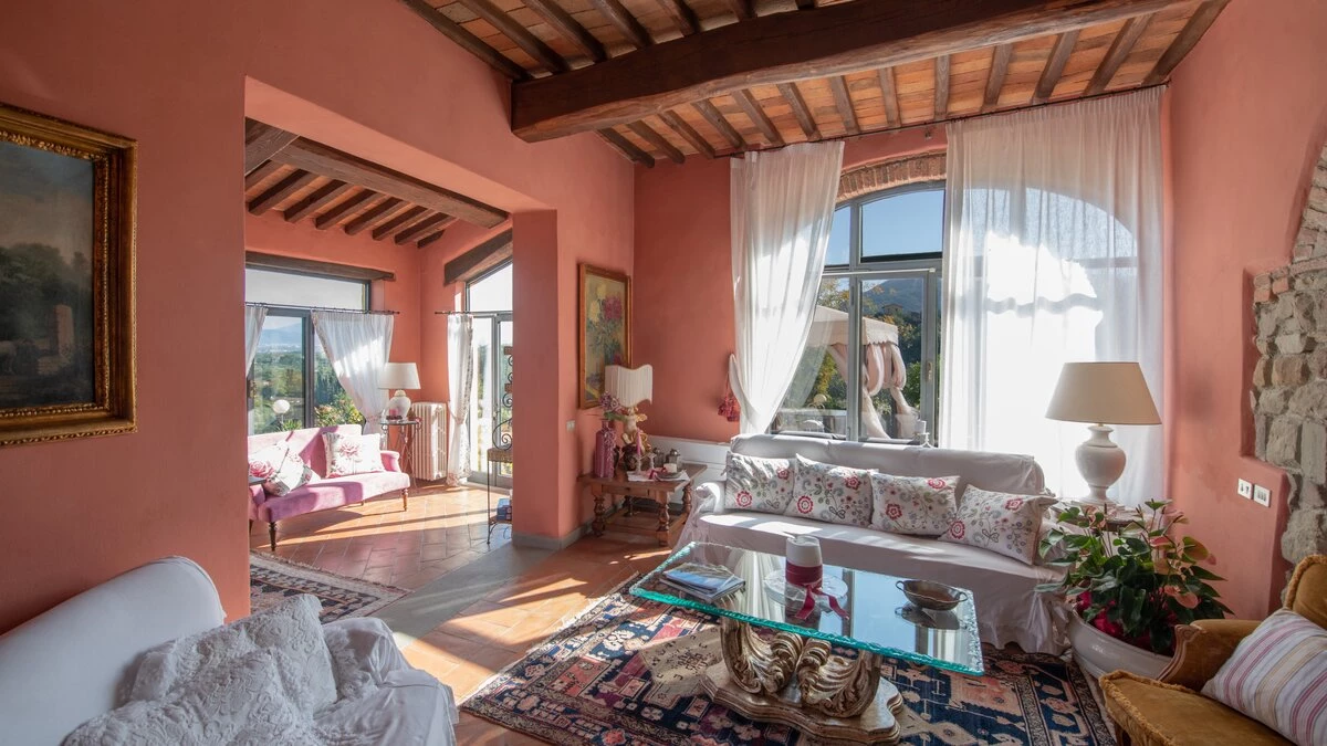 Secluded in the countryside just 1.5km from shops and restaurants in Casalguidi and 11km from all amenities in historic Pistoia, this pretty yellow house with breathtaking panoramic views is striking from the get-go. Surrounded by olive groves, fruit trees and delicate rose gardens, this is a retreat that's been made for complete privacy. The large outdoor swimming pool welcomes lazy days, with loungers, furnished patios and oversized umbrellas, while inside, the villa indulges with a classic country-chic character. Through the spacious main entrance hall, the large open-plan lounge is a relaxation haven, furnished with sink-worthy sofas and intricately patterned rugs. Both simple yet sophisticated, some of the room's eye-catching furnishings include an old wooden piano and the standout corner fireplace. Through the sitting room an adjoining dining area has sliding glass doors that lead out to a charming terrace overlooking lovely country views. Continue to the spacious high-spec kitchen - equipped with all the essential mod cons - and there's a second cosy sitting area with armchairs and a smaller fireplace. Following the same rustic-chic style, each of the bedrooms has a simple design, with subtle pastel-coloured walls and exposed wooden beam ceilings. With bedrooms and sitting rooms on the ground and first floor, the layout is ideal for two families.