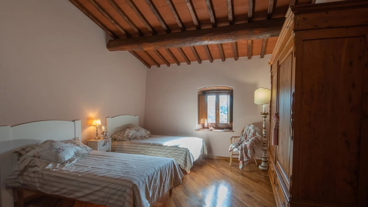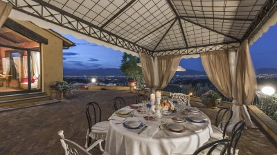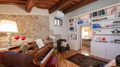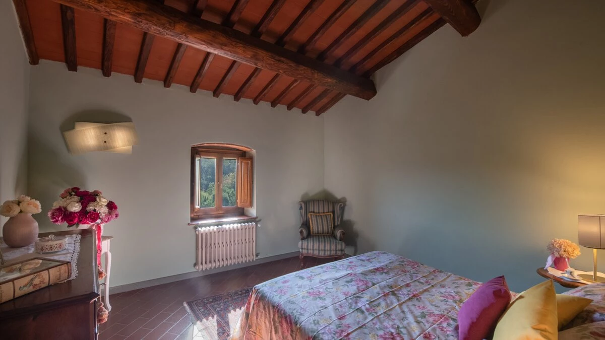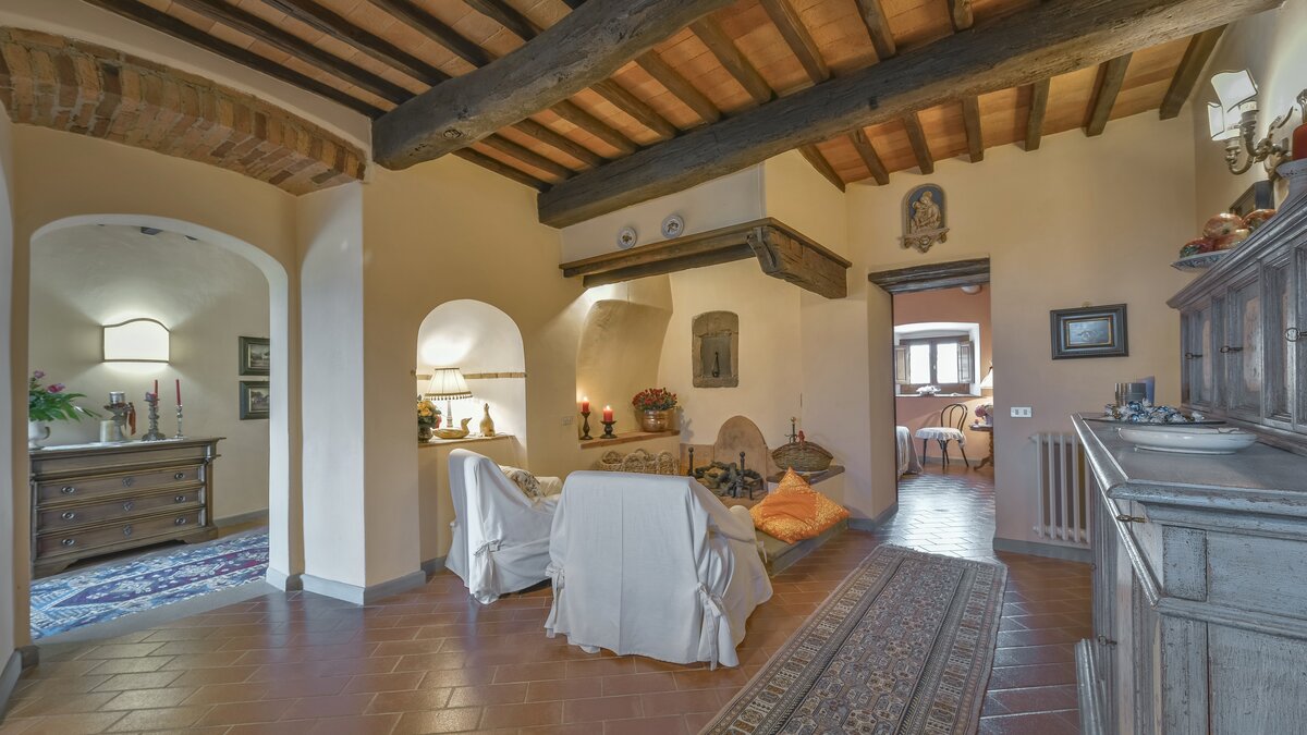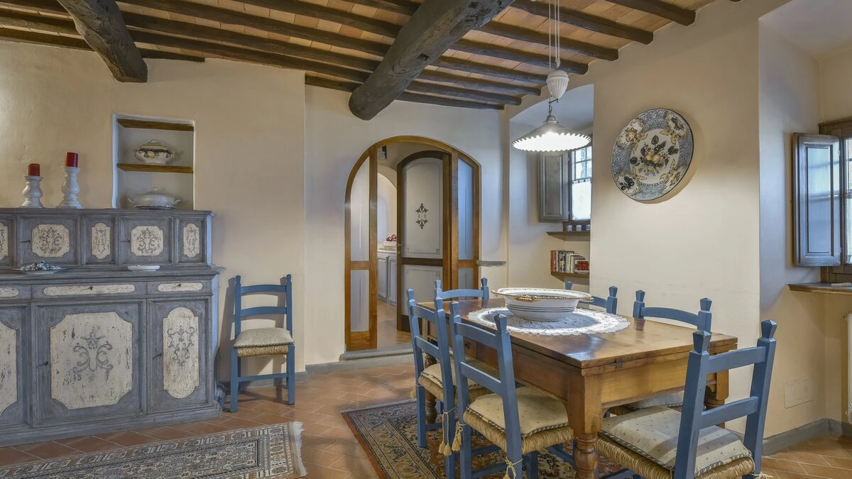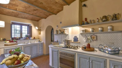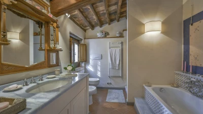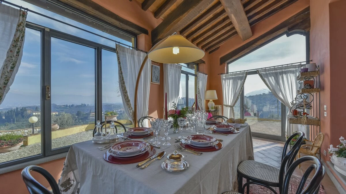 Secluded in the countryside just 1.5km from shops and restaurants in Casalguidi and 11km from all amenities in historic Pistoia, this pretty yellow house with breathtaking panoramic views is striking from the get-go. Surrounded by olive groves, fruit trees and delicate rose gardens, this is a retreat that's been made for complete privacy. The large outdoor swimming pool welcomes lazy days, with loungers, furnished patios and oversized umbrellas, while inside, the villa indulges with a classic country-chic character. Through the spacious main entrance hall, the large open-plan lounge is a relaxation haven, furnished with sink-worthy sofas and intricately patterned rugs. Both simple yet sophisticated, some of the room's eye-catching furnishings include an old wooden piano and the standout corner fireplace. Through the sitting room an adjoining dining area has sliding glass doors that lead out to a charming terrace overlooking lovely country views. Continue to the spacious high-spec kitchen - equipped with all the essential mod cons - and there's a second cosy sitting area with armchairs and a smaller fireplace. Following the same rustic-chic style, each of the bedrooms has a simple design, with subtle pastel-coloured walls and exposed wooden beam ceilings. With bedrooms and sitting rooms on the ground and first floor, the layout is ideal for two families.