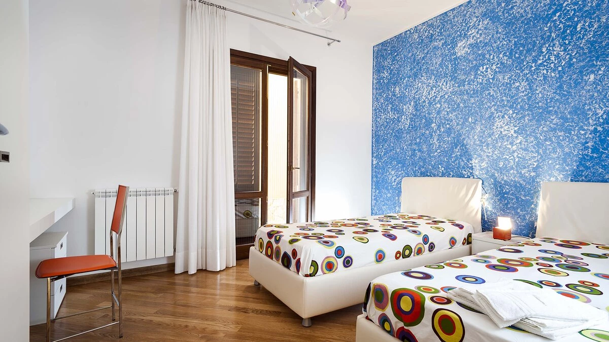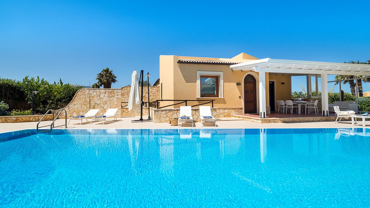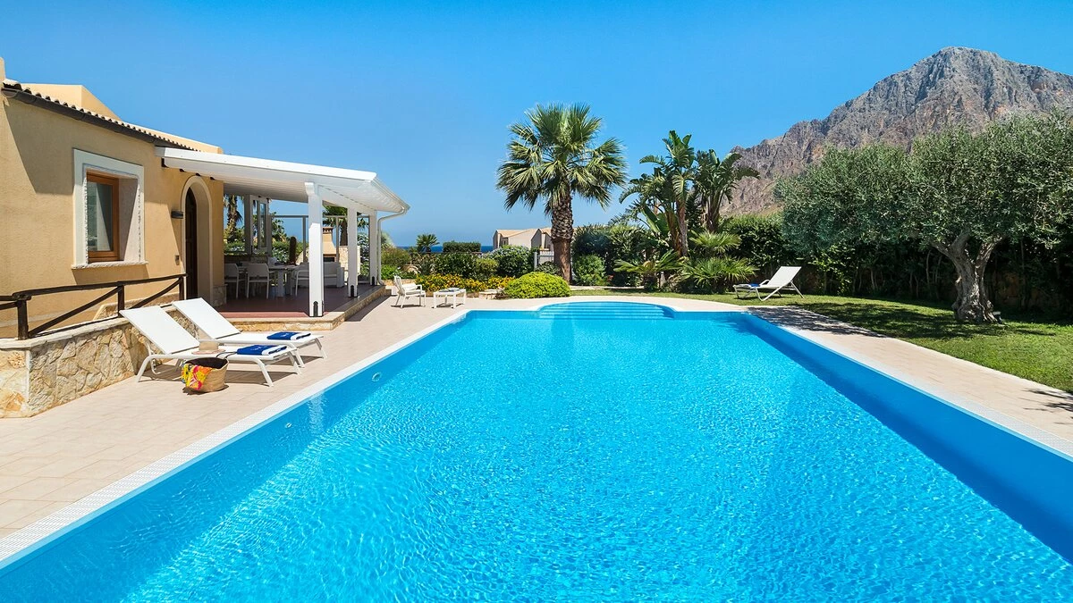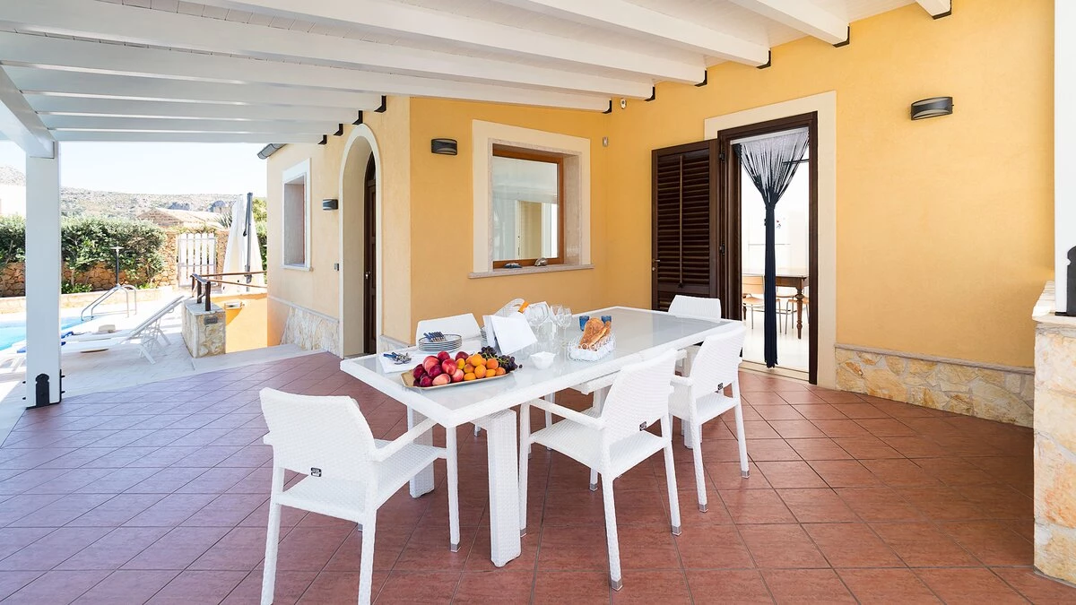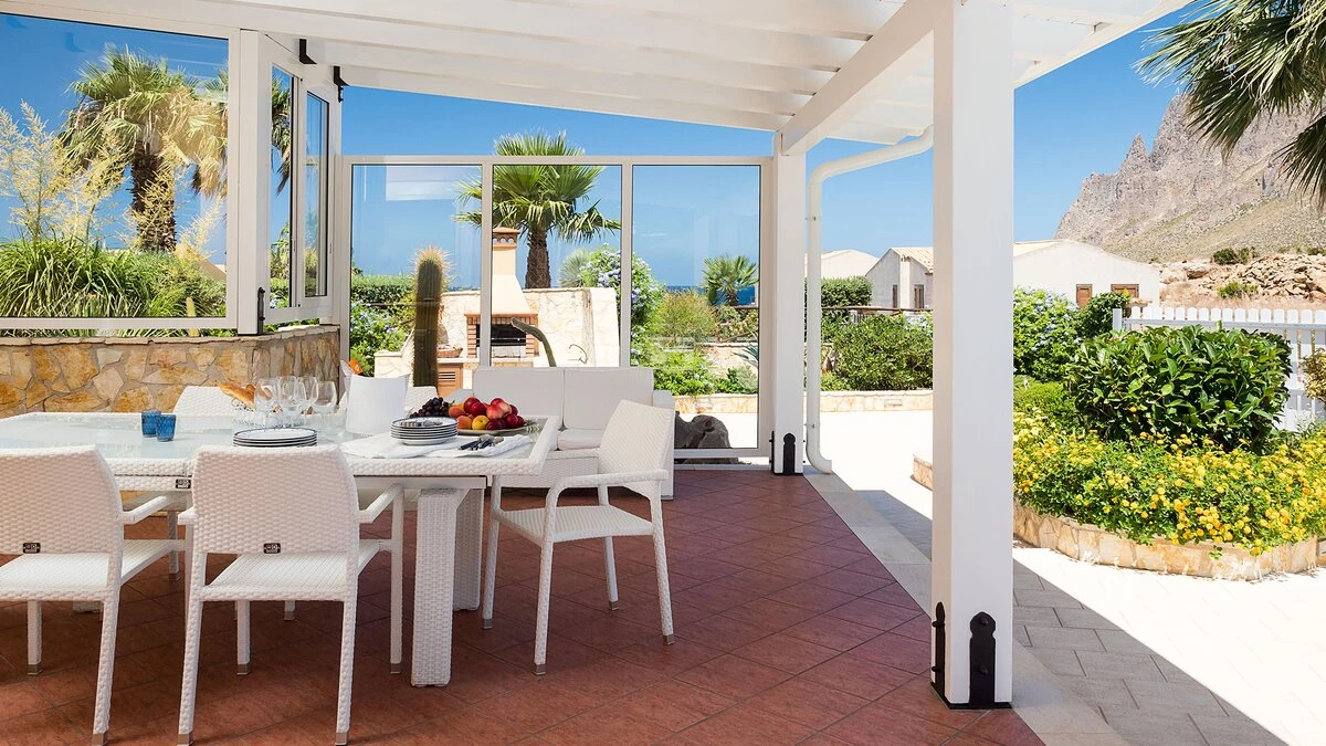 This superbly located villa is just a 200m walk away from a beautiful sandy beach and nearby restaurant, while further local restaurants and shops are a short drive away in charming Custonaci. Inside the villa is bright and airy, with cool marble floors and pops of colour in feature walls and chic soft furnishings. The living space is large and open plan, with a comfortable corner sofa and large screen TV, while the fully-equipped kitchen also has space for dining indoors should guests desire. On the lower ground floor there are three spacious bedrooms, plus one bathroom and shower room at this level and a shower room the ground floor.