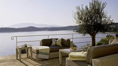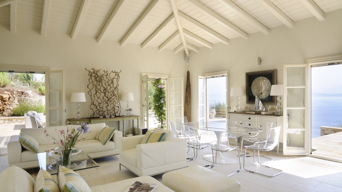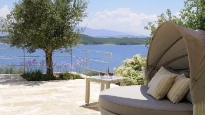 A fabulous family villa, Atolikos House sits right at the water’s edge on the private headland of The Point Estate, its ten metre pool set in a sunken terrace with uninterrupted views of the beautiful bay. Behind it, broad terraces are stylishly furnished for al fresco living, with a covered dining and barbecue area, an open-air ‘sitting room’ and spacious expanses for leisurely lounging. All this is overlooked by the beautifully designed villa, its graceful and traditional exterior quietly in harmony with the coastal Corfiot landscape while, inside, the style is ultra-contemporary and very luxurious.