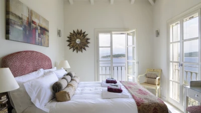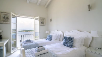 An archway leads from the smart white sitting /dining room to an equally modern kitchen, with multiple French doors opening out to the sea view terraces, flooding the villa with light, and bringing the glorious views to every room.  Steps and a meandering path lead to sea swimming from a jetty below the house, shared only with sister-villa Cepheus House, also featured by CV Villas. Kassiopi’s cafés, bars and restaurants are a fifteen minute walk away.