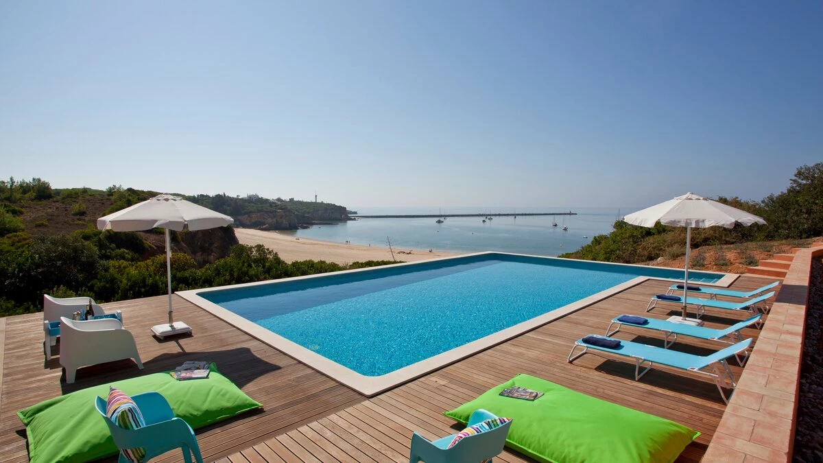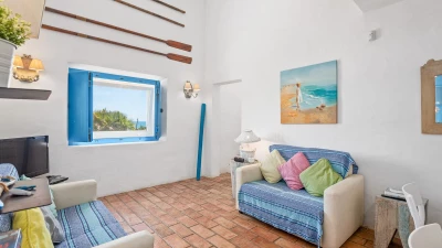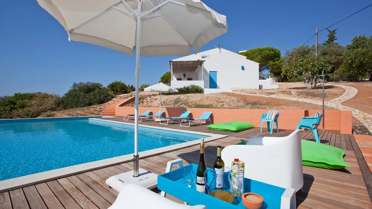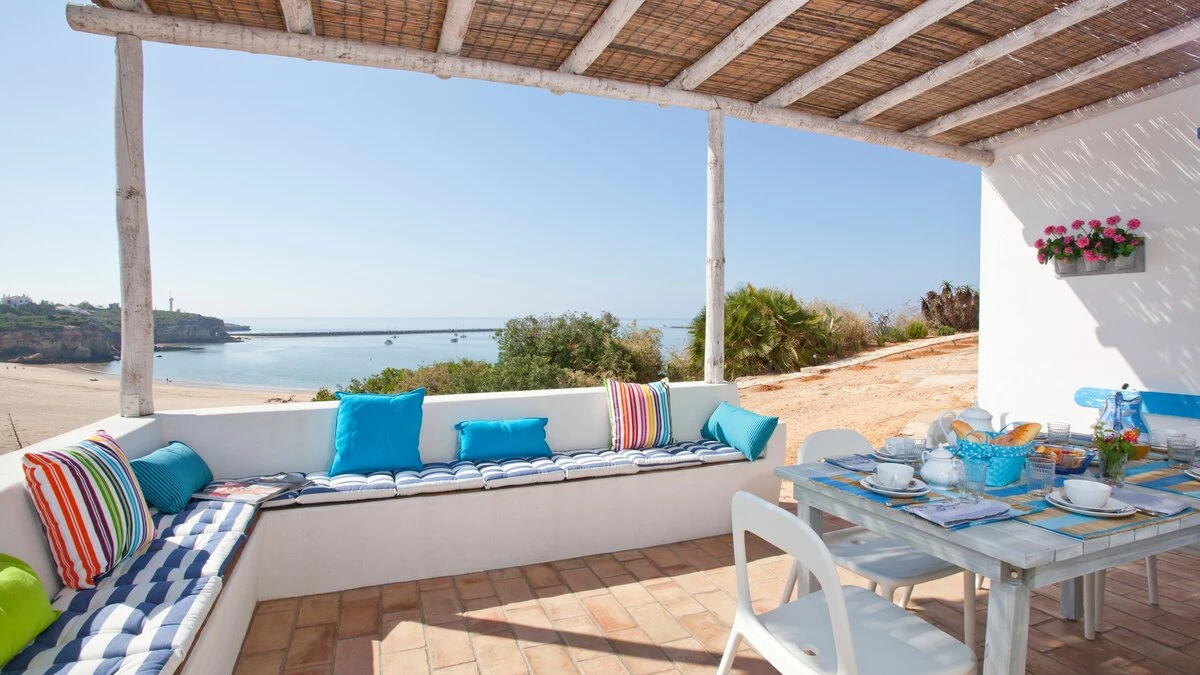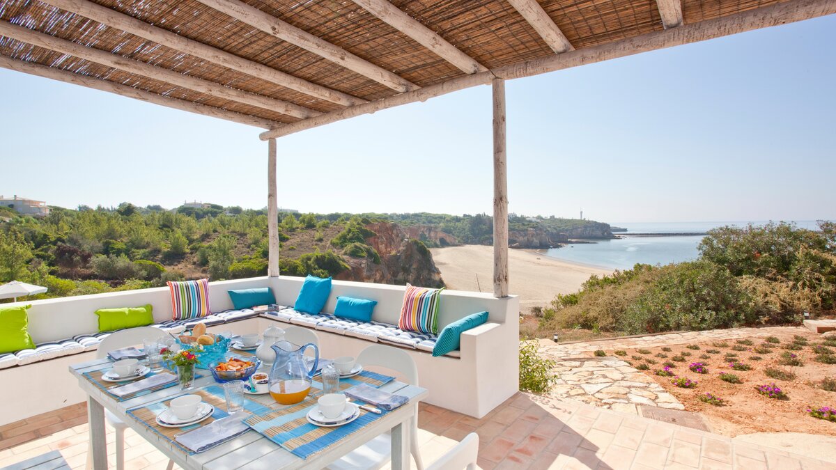 A happy little villa, where crisp white décor is splashed with summer colours in fabrics and artworks, Beach Cottage is just 200m from a broad sandy shore, reached along a gently sloping track through the grounds of its historic private estate. This rather special spot enjoys a peaceful sense of seclusion, though shops and restaurants in old-world Ferragudo village are a walkable 1km away; and golf, tennis and water sports are all within a 4km drive. Refurbished to add a contemporary twist to its characterful interiors, the villa’s three bedrooms are furnished with charming simplicity, fitted with air conditioning, and served by stylishly modern bath and shower rooms; two twin rooms on the split-level ground floor and a double privately occupying the floor above. The cheerful living room leads up to the kitchen area, and opens out to a beautiful shaded terrace for al fresco meals, with views of the sea and sands, a portable barbecue, and built-in seating with brightly coloured cushions. And steps lead down from here to a generously sized swimming pool, hemmed by a timber sun deck with ample chairs and loungers.