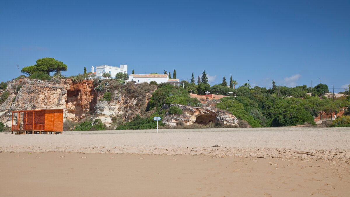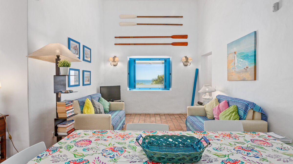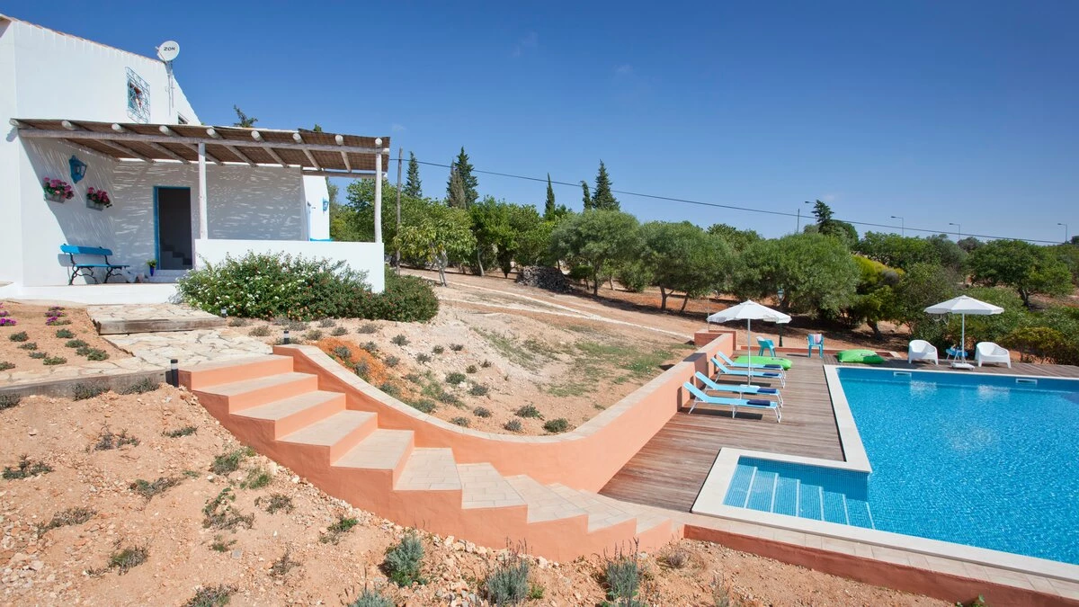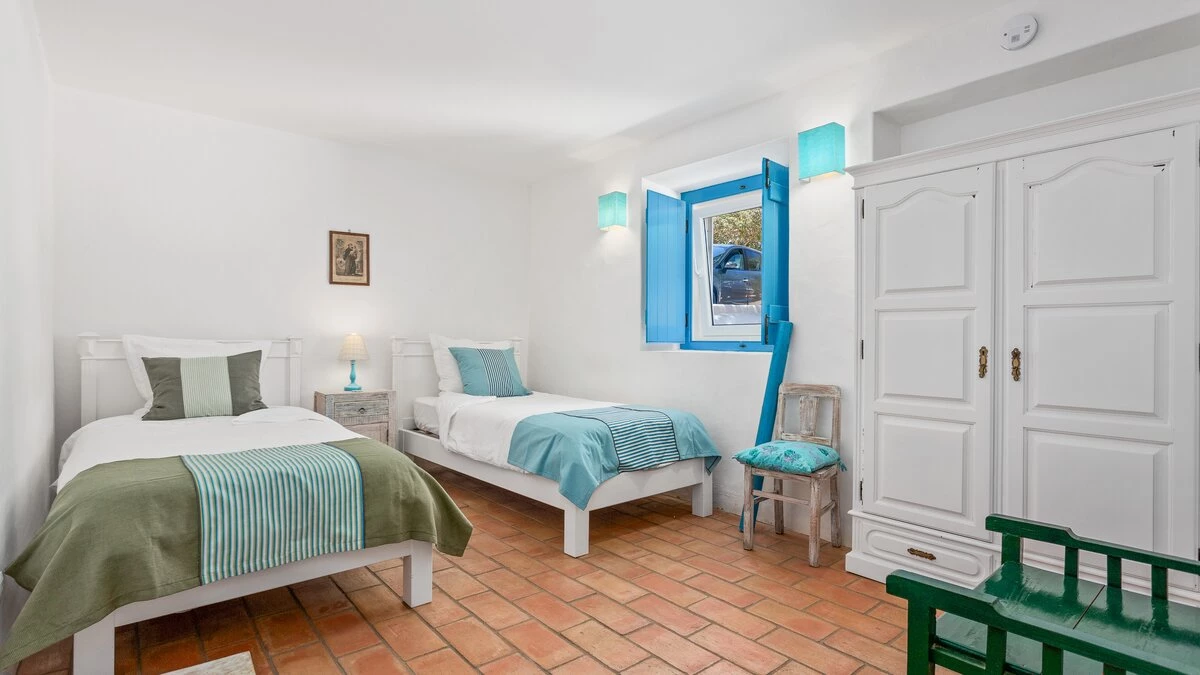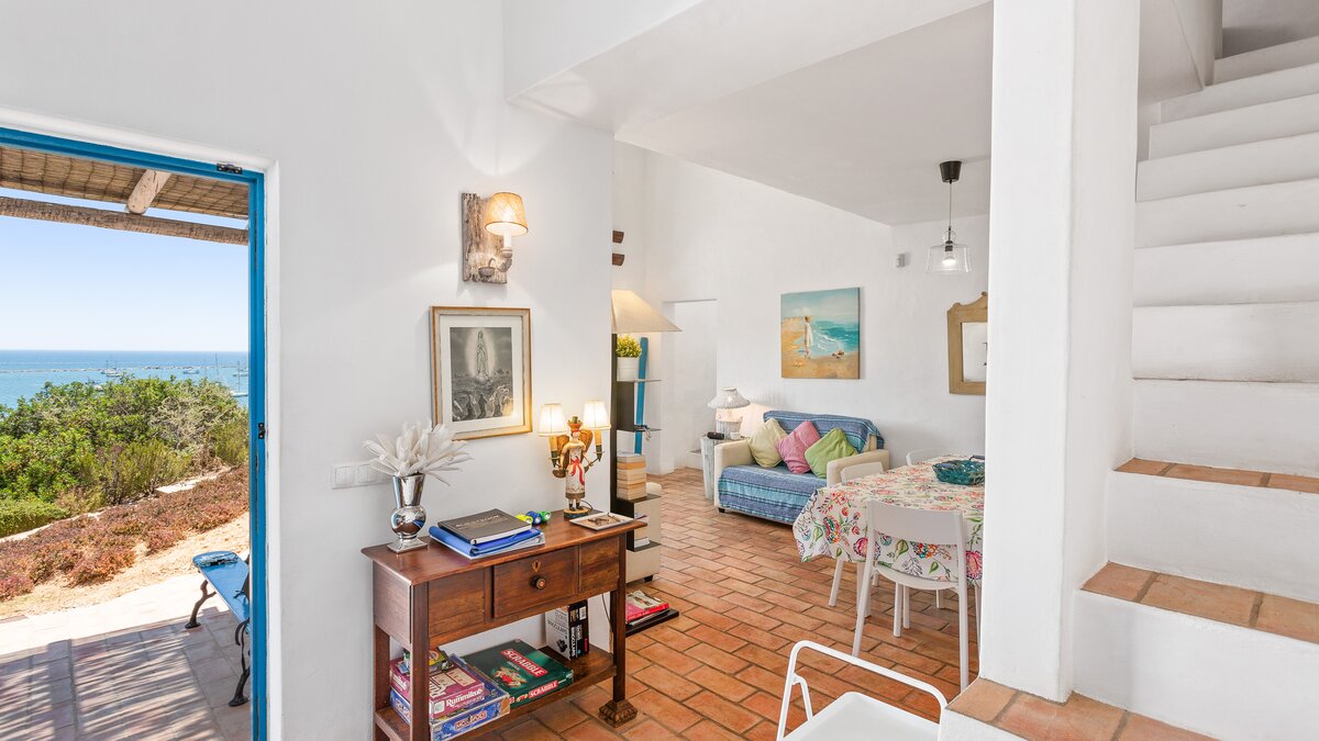 A happy little villa, where crisp white décor is splashed with summer colours in fabrics and artworks, Beach Cottage is just 200m from a broad sandy shore, reached along a gently sloping track through the grounds of its historic private estate. This rather special spot enjoys a peaceful sense of seclusion, though shops and restaurants in old-world Ferragudo village are a walkable 1km away; and golf, tennis and water sports are all within a 4km drive. Refurbished to add a contemporary twist to its characterful interiors, the villa’s three bedrooms are furnished with charming simplicity, fitted with air conditioning, and served by stylishly modern bath and shower rooms; two twin rooms on the split-level ground floor and a double privately occupying the floor above. The cheerful living room leads up to the kitchen area, and opens out to a beautiful shaded terrace for al fresco meals, with views of the sea and sands, a portable barbecue, and built-in seating with brightly coloured cushions. And steps lead down from here to a generously sized swimming pool, hemmed by a timber sun deck with ample chairs and loungers.
