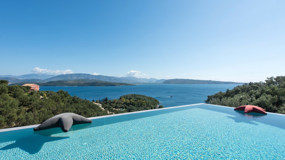 Benessere Rock House truly shines with its incredible exterior spaces, adorned with seating areas and sun loungers. The main pool juts out towards the water, offering an unparalleled swimming experience with the Ionian Sea as your backdrop. Multiple terraces and lounging areas are strategically placed to make the most of these spectacular views, whether you're sunbathing, enjoying an al fresco meal, or simply relaxing with a book. The outdoor dining area is particularly noteworthy, providing a sun-drenched spot for memorable meals in a coastal setting. While Benessere Rock House serves as your own private oasis, it's also conveniently located for exploring Corfu's many charms. The picturesque Kerasia beach is just a stone's throw away, and the vibrant towns of St Stephanos and Kassiopi, with their tavernas and shops, are within easy reach, allowing you to experience the best of both worlds during your stay.