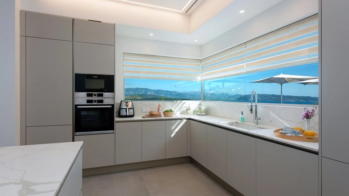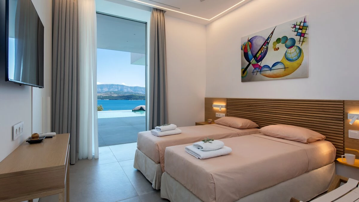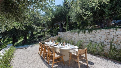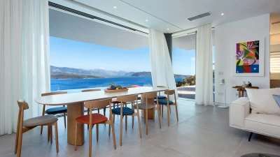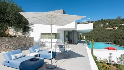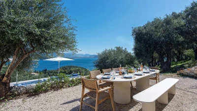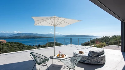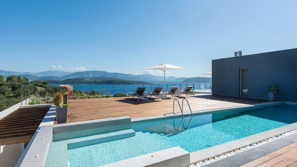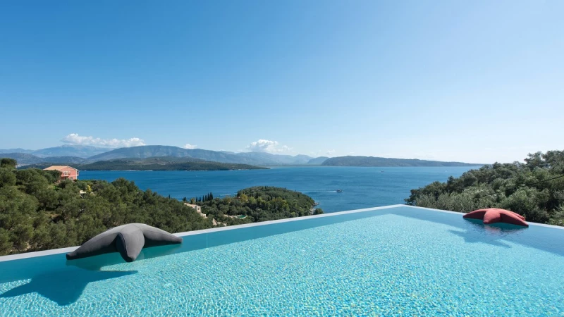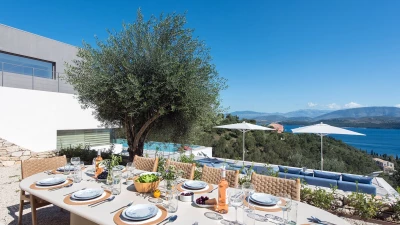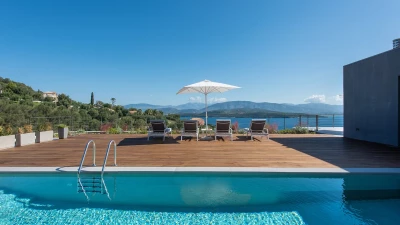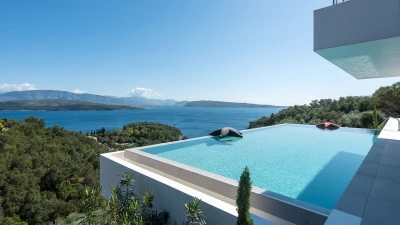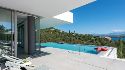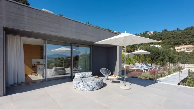 Benessere Rock House is a stunning, brand-new property nestled on a hillside in Kerasia, Corfu, offering a fresh take on Mediterranean living. This impressive villa is perfect for families or groups of friends seeking a contemporary retreat. Boasting two swimming pools, including a unique rooftop lap pool, alongside a home gym and breathtaking sea views, Benessere Rock House sets itself apart from traditional Corfiot villas with its modern architecture and state-of-the-art technology. The property's spacious layout and well-proportioned bedrooms make it ideal for larger groups, while its various outdoor seating areas and sun-kissed dining space provide ample opportunity to admire coastal panoramas in a social setting.