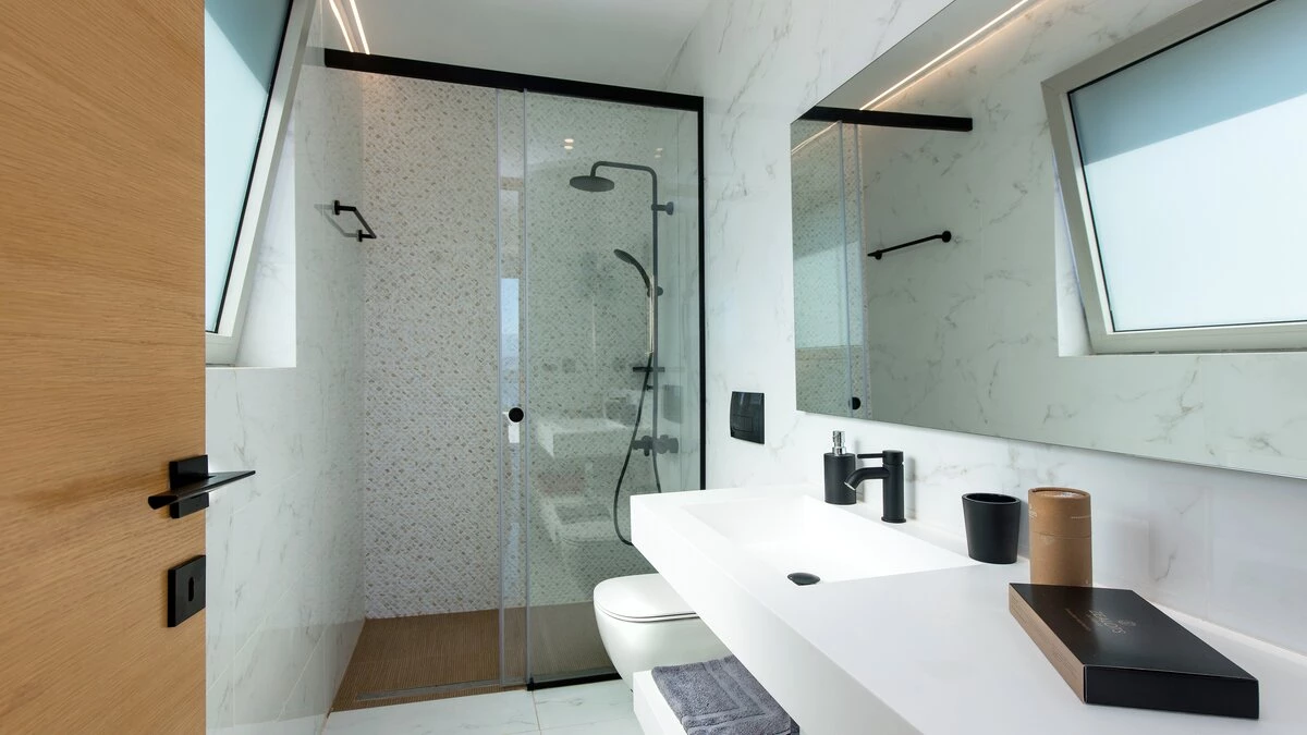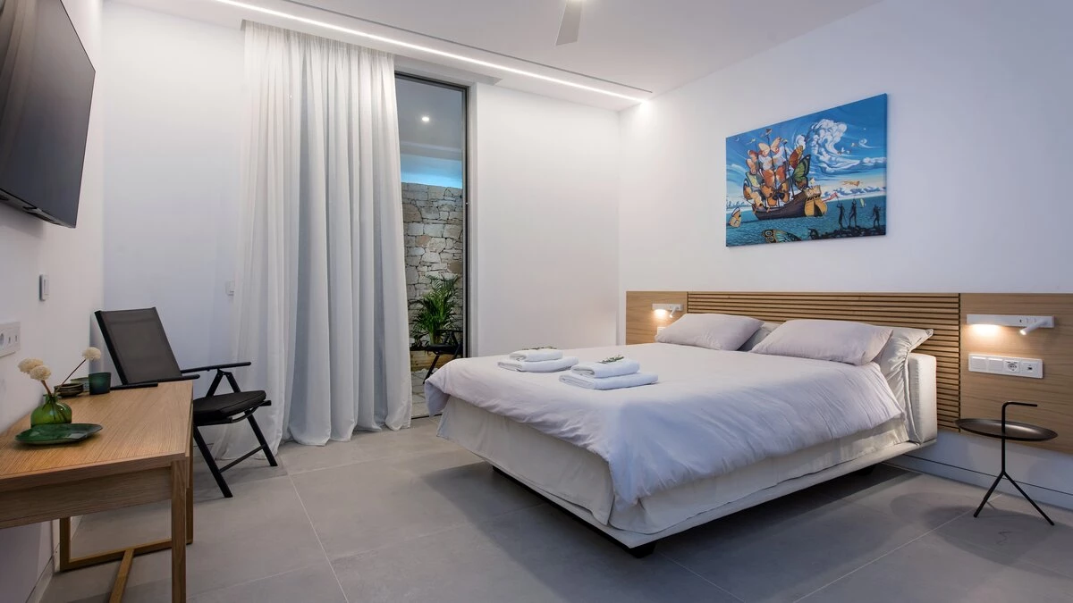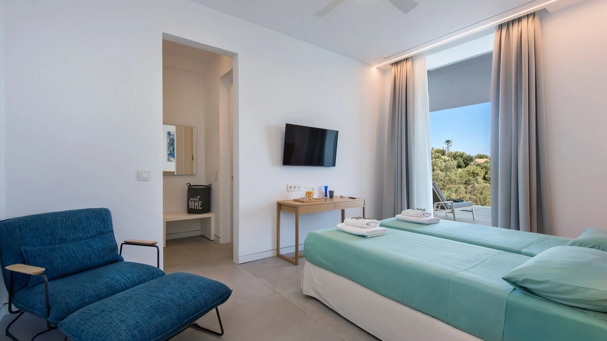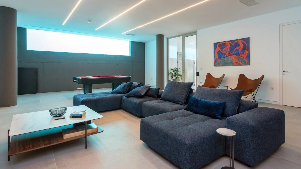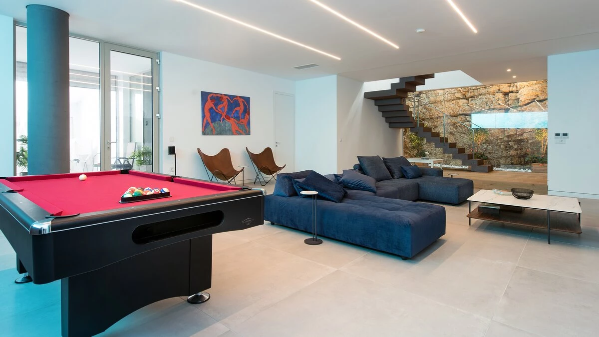 Stepping inside the villa, guests are greeted by sleek, contemporary interiors that exude sophistication. For fitness lovers, the home gym provides ample space for exercise, or even meditation. The bright and airy living room opens out onto a striking infinity pool, creating a seamless indoor-outdoor living experience. On the lower ground floor, the spacious games room looks onto the pool from below, offering a unique perspective from the interior. Each bedroom is generously sized and styled with modern flair, ensuring comfort for all guests throughout their stay. On the top floor, the master bedroom has direct access to the rooftop lap pool - perfect for those who like to start their day with an invigorating swim.