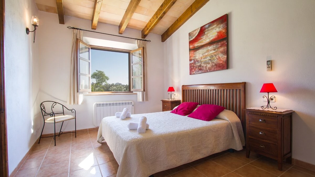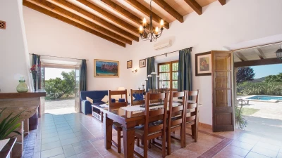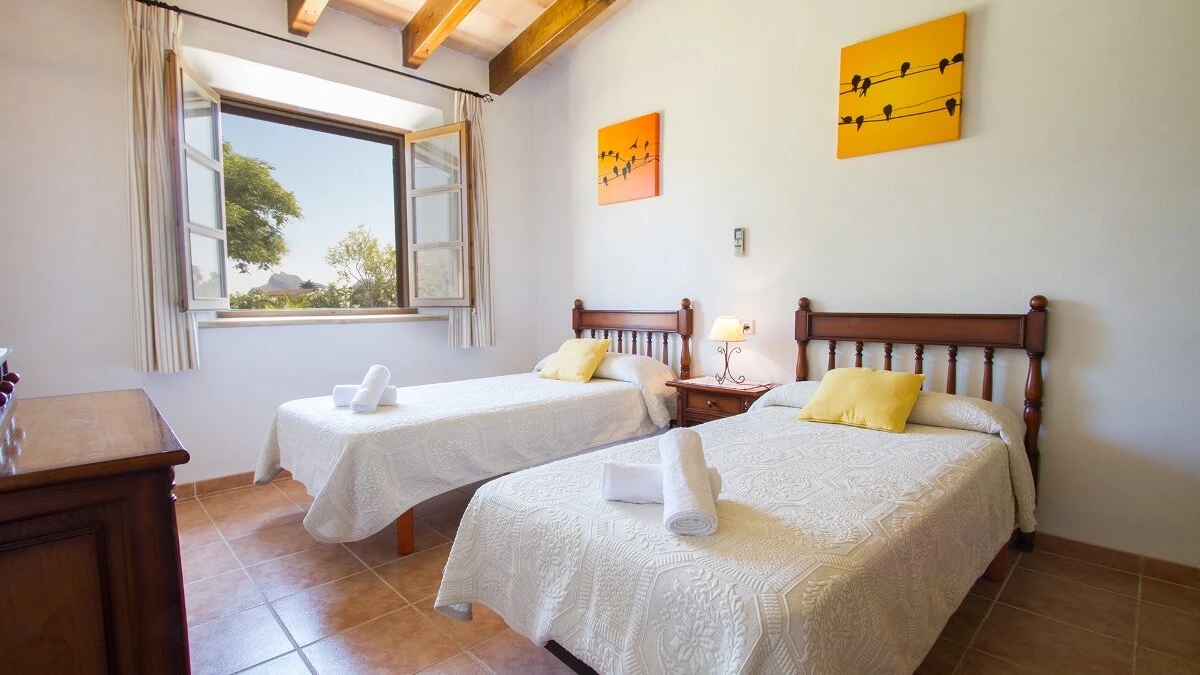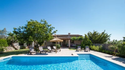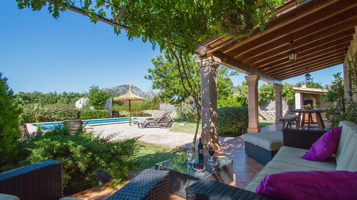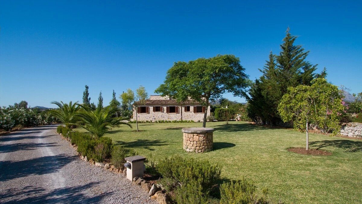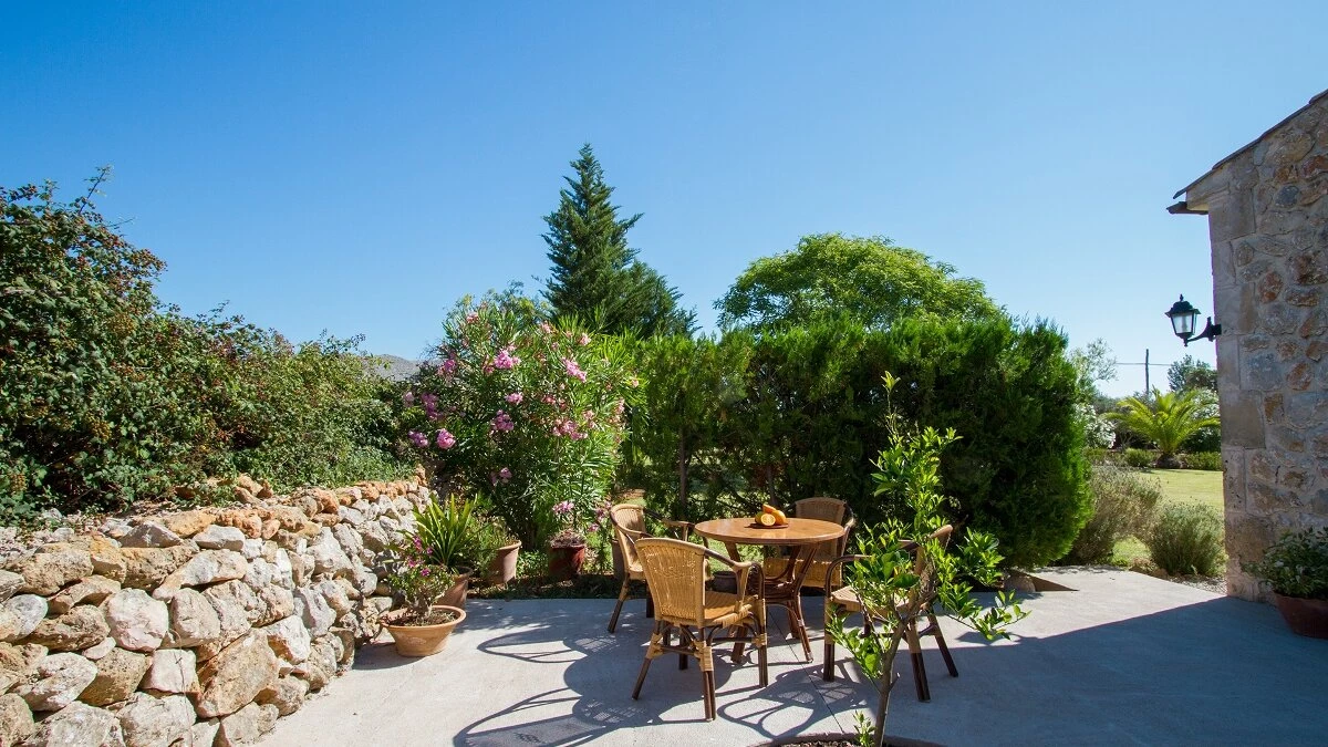 In a secluded countryside location, yet just 3km from Pollensa and 6km from Puerto Pollensa, this very popular villa is a fine choice for a family holiday. Set in gardens of 6000m ², the villa is generously proportioned and thoughtfully equipped, indoors and out, encouraging open-air living with a built-in barbecue area and ample shaded, vine covered terraces furnished for dining and relaxing. Inside there is an airy high ceilinged sitting room with dining area opening to the terraces, a separate modern kitchen with breakfast area and a pantry and utility room. From one end of the dining room, there is access to the pretty, spacious, bright master bedroom with en suite bathroom. A hallway from the dining area leads to two further twin bedrooms with intricate artwork, one with an en suite bathroom and one with an adjacent full bathroom. The pool is set among spacious sun terraces and there are ample lawned gardens at the rear of the property. Early booking essential.