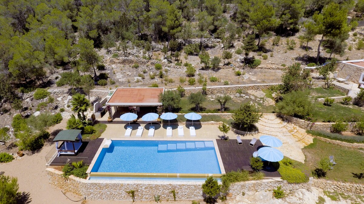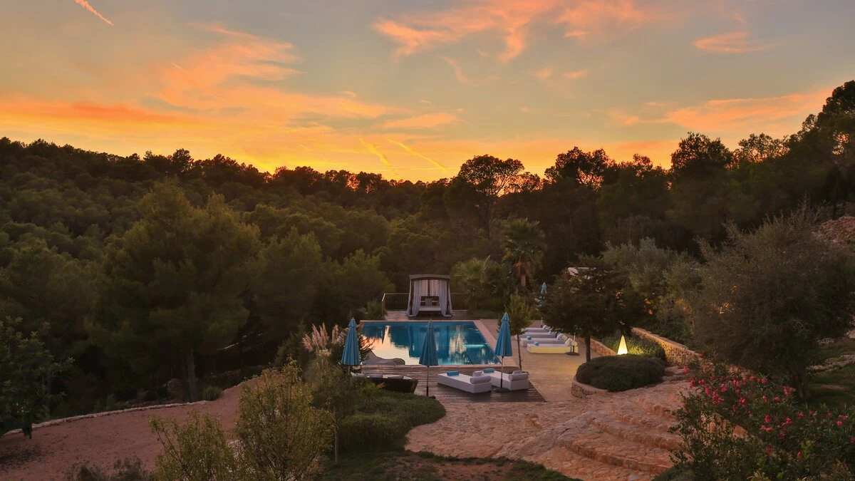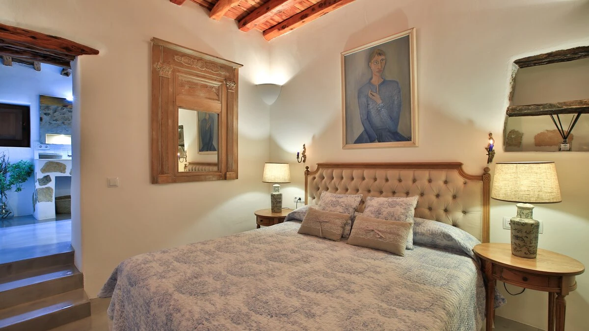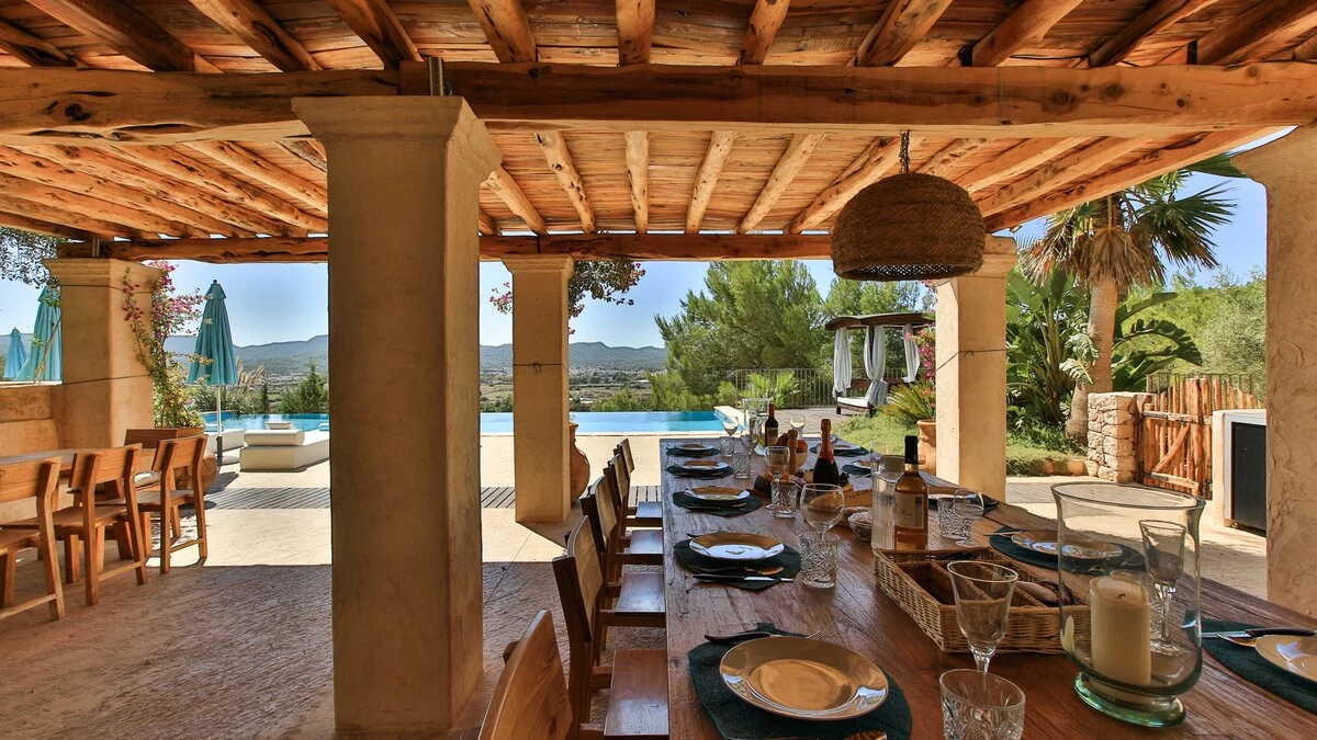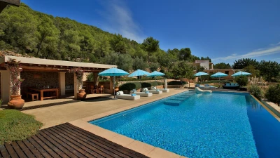 Affording you total privacy and maximum comfort, this large estate is the perfect choice for a large group. There's an outdoor infinity pool that looks over great views of the farmland, and four outdoor seating spots (including two scenic dining areas). Inside the villa, the two separate living rooms are great for a cosy villa night in - while both have plenty of character, one is set in the property's original grain mill. Throughout the farmhouse are six double bedrooms, four of which include the luxury of a private en suite. Choose the 'tower master suite' for better views and an outdoor terrace, or head to 'the studio' for a private living area and terrace. If you're looking to explore more of the island, San Antonio is just 2km away while Ibiza town is an 18.3km drive from the villa. For beaches, you're less than 3km away from the pretty white sands of S'Arenal.