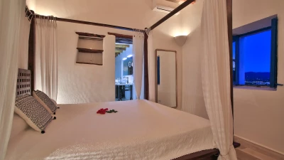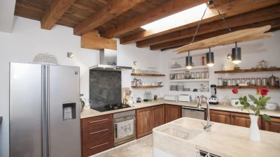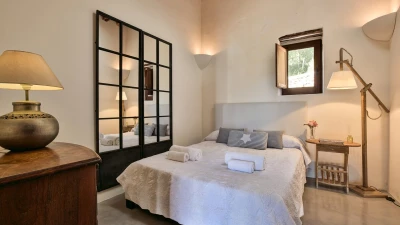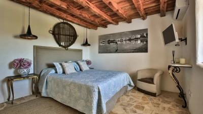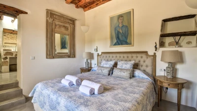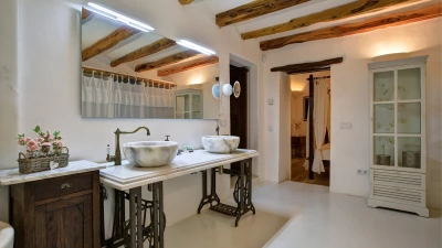 This large, private farmhouse is steeped in local history, having been owned by the same family since it was built over 300 years ago. It's a luxurious bolthole, set away from the neighbours, which sits secluded in its own hilltop estate overlooking distant views of the island's west coast. The farmhouse has been completely reimagined, refined to an indulgently high spec where modern touches pair perfectly with old heritage elements. Original stone built walls catch the eye with a stylish whitewash, and there's plenty of character throughout the farmhouse's interior - high wooden beamed ceilings and authentic tiled floors add to the rustic yet sophisticated feel.