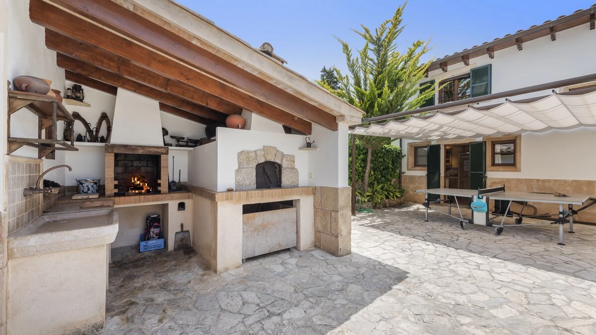 Outside, a lovely summer kitchen is designed for long, leisurely lunches, fully equipped with sliding doors overlooking the pool and gardens. The outdoor dining space is simply ideal for al fresco living, while the gardens offer plenty of space for sunbathing, pool games and relaxation. The property is serenely located among lush greenery for a sense of seclusion, yet is just a short drive from Pollensa and Port de Pollensa.