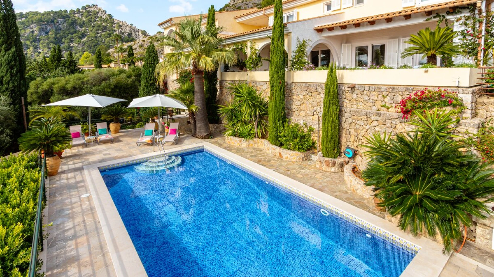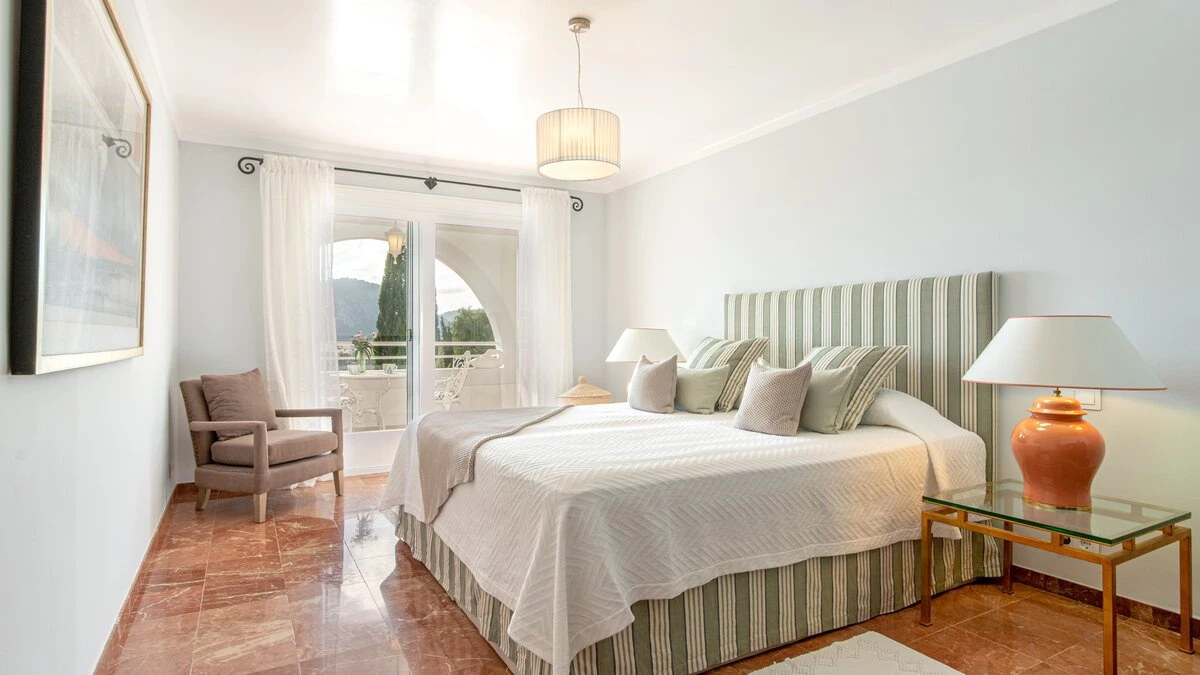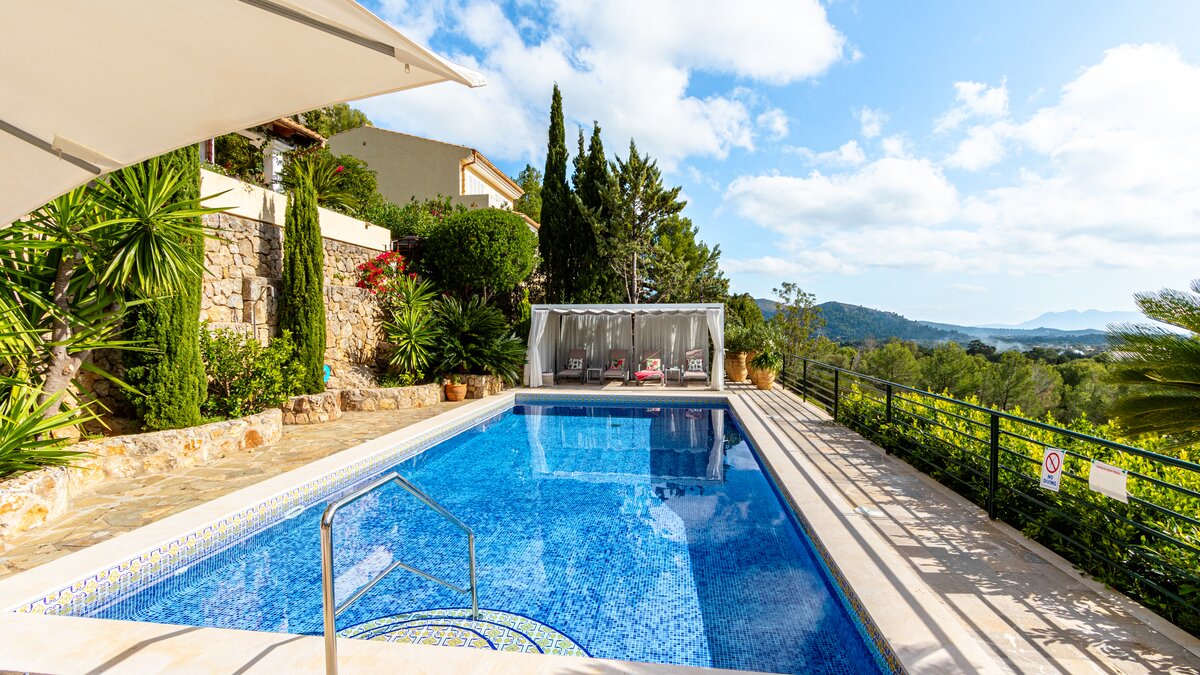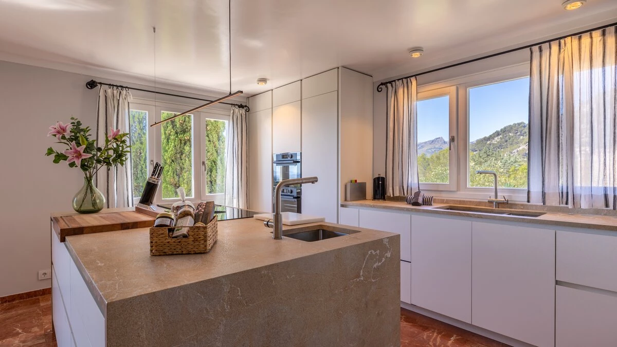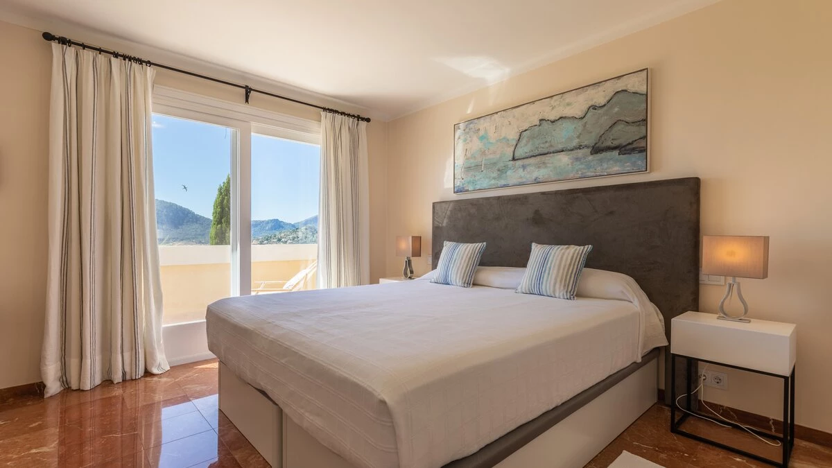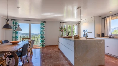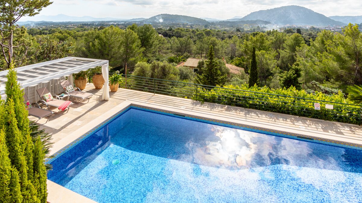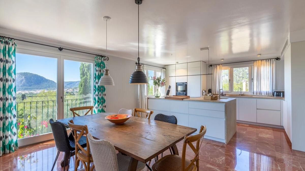Just 6km from sandy beaches in the pretty coastal resorts of Cala San Vicente and Puerto Pollensa, and 4km from the Pollensa golf course, this lovely house with fabulous sweeping views out to the Bay of Alcudia is very well positioned for all the essentials of an island holiday, yet it is cushioned in peace and privacy. Inside this is an exceptionally spacious property with a large kitchen with dining area and a very large and airy sitting room opening to a furnished terrace overlooking the pool.Upstairs there is the master bedroom with super king size bed and en suite bathroom which opens to the terrace with distant sea views, as well as two further double bedrooms with bathrooms en suite and terrace access opening to the views. Completing the bedrooms is a twin room with sole use of a separate bathroom. Comfortably informal and well-proportioned, this property is well-equipped. Steps lead down from the house to a sunny terrace furnished with ample sun loungers, the focal point of which is the private pool with stunning mountain views. From here, guests stroll down into Old Pollensa with selection of cafes, restaurants, boutiques approximately 25 - 30minutes from the villa. Lively Puerto Pollensa with boat and cycle hire is also within easy reach. The area is renowned for cycling and top of the range bicycles can be rented and delivered to the villa.