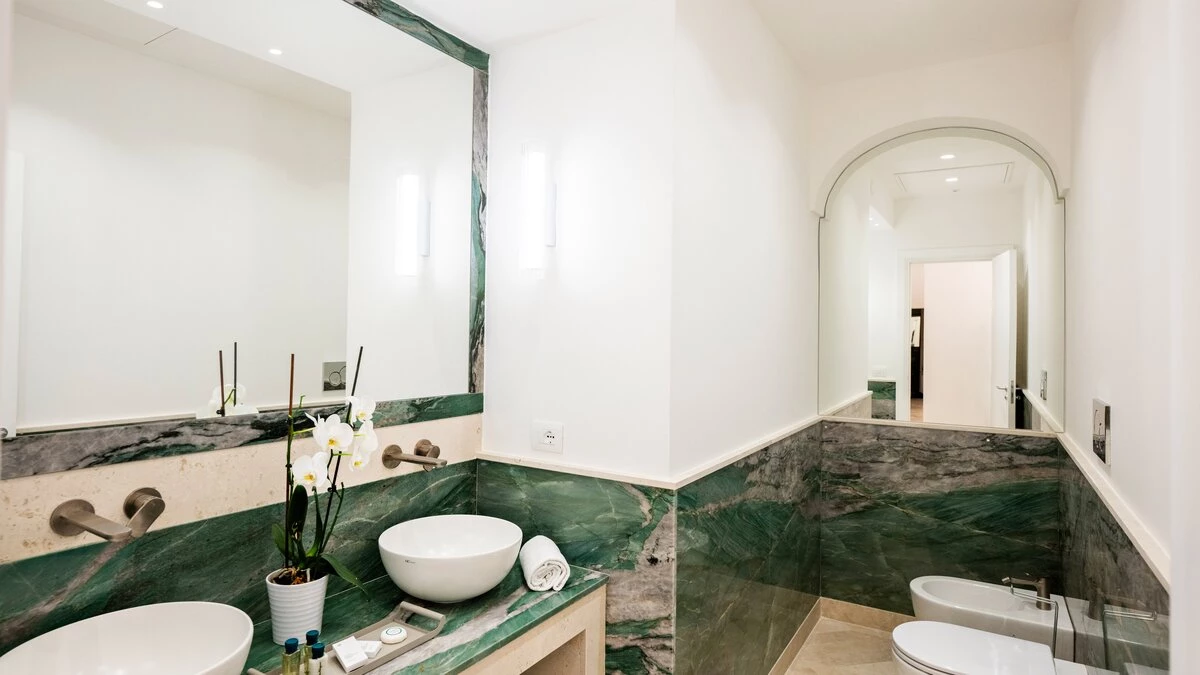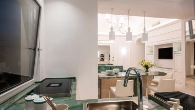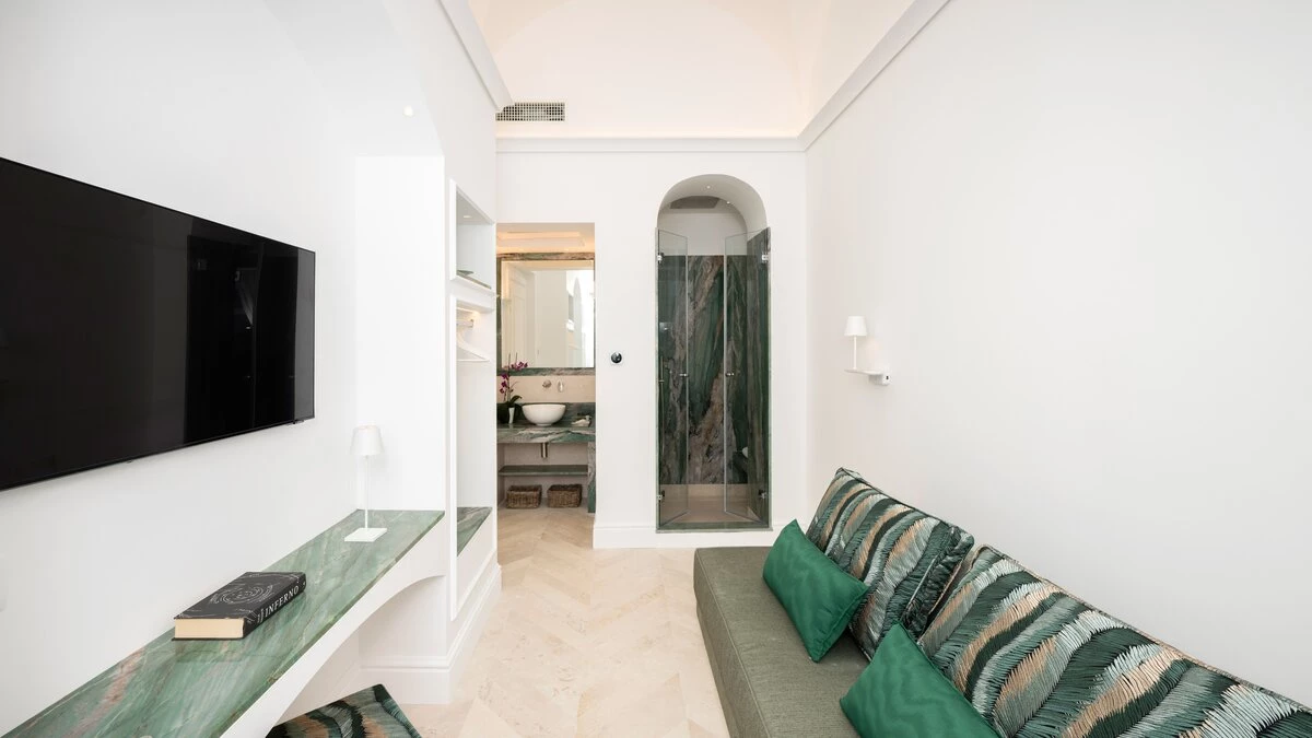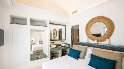 Across the terrace, the accommodation is cleverly divided into two independent bedroom suites, offering flexibility and privacy. Each double bedroom features a super king-size bed, in-room basins, television and its own shower facilities, making the layout particularly appealing for two couples travelling together. A shared cloakroom with WC and bidet adds further practicality.