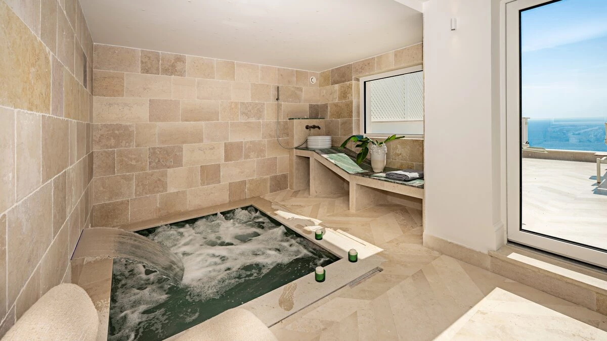 One of Casa Aurora’s standout features is its intimate spa area. An indoor hydro-massage pool with waterfall feature is paired with an infrared sauna and Bluetooth audio system, creating a soothing space to unwind after a day exploring the coast.