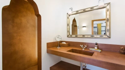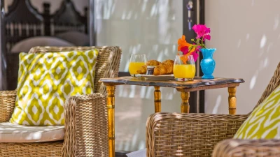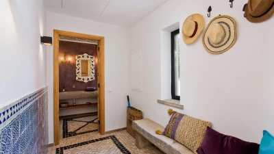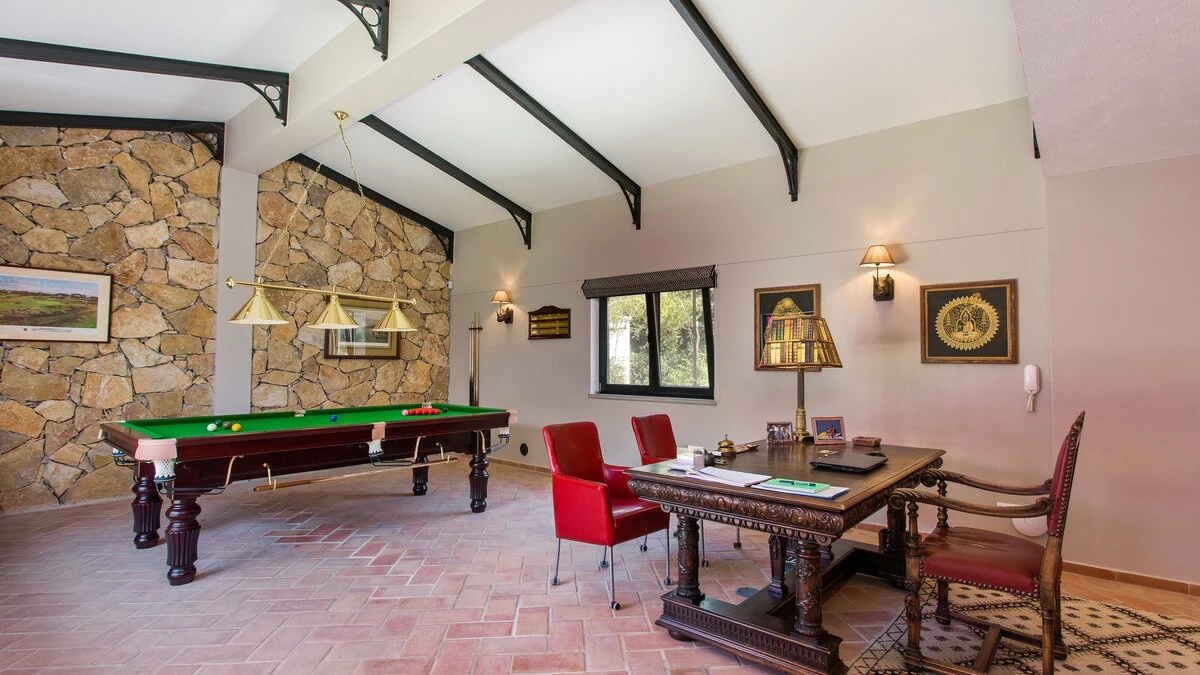 The large open plan sitting/dining room has been elegantly furnished with neutral coloured sofas interjected with pops of colour in cushions and dining room chairs. This room is equipped with satellite TV and a Sonos system and from here you can access the pool as well as a covered pool terrace, furnished for al fresco dining and relaxing. There is also a fully equipped kitchen with dishwasher, large fridge and freezer, ovens, a microwave and a Delonghi bean to cup espresso and cappuccino machine from which you there is access out to an ivy covered courtyard with built in barbecue area. A Moroccan style doorway leads from the sitting room to the bedroom wing with three double bedrooms with satellite TV, safe and ensuite shower rooms and two further bedrooms, one twin and one bunk room which share a separate shower room. All bathrooms have been constructed with polished micro cement, each in their own stylish colour. Across the inner courtyard, at the front of the house, is the extension to the villa offering a games room with pool table. There is also a separate laundry room with a washing machine, dryer and iron available.