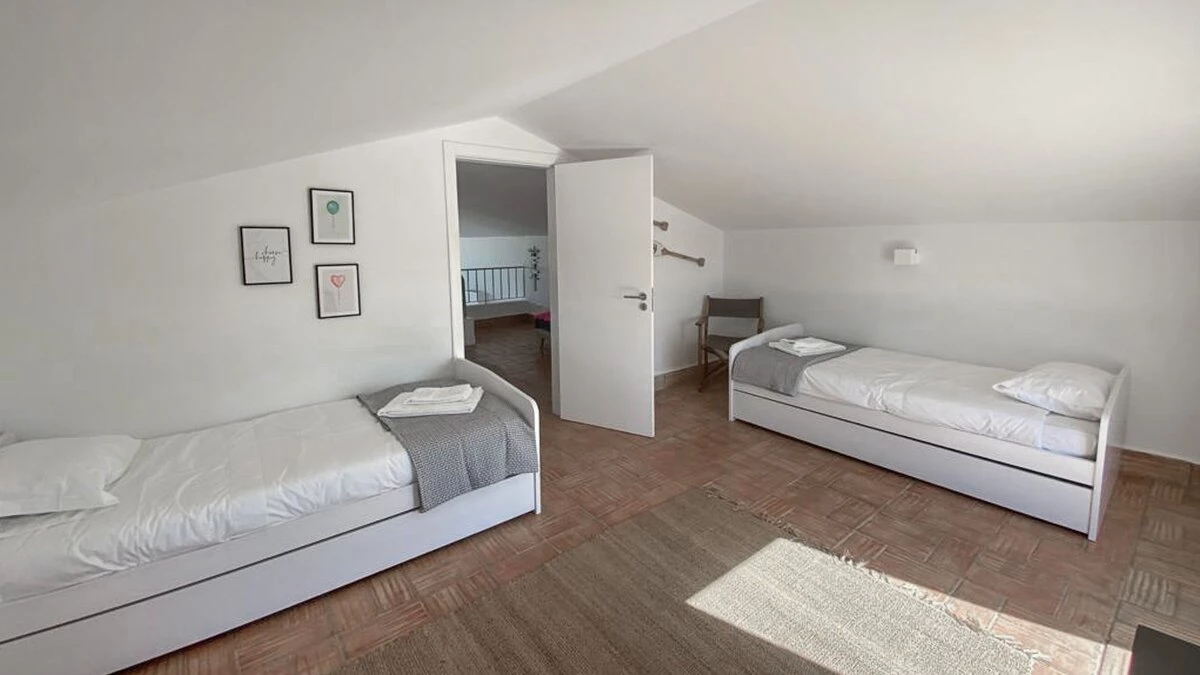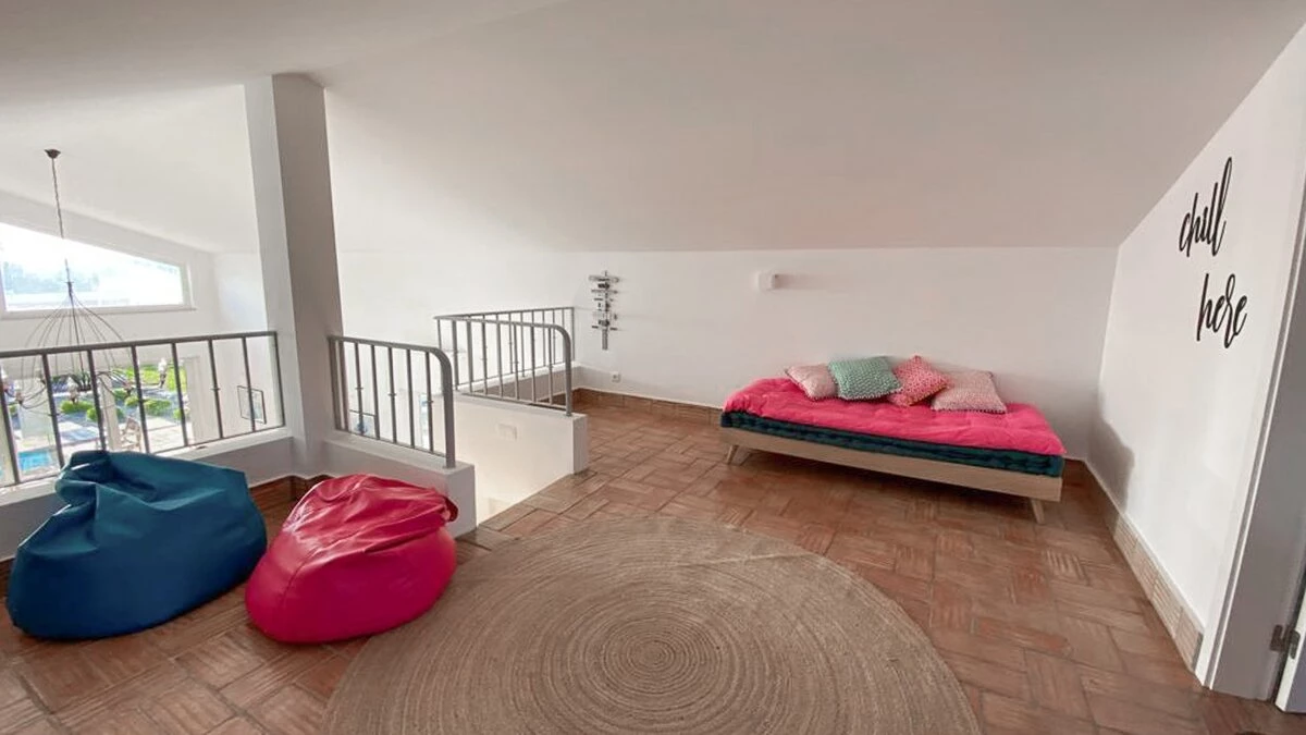 An open staircase rises from the sitting room to a mezzanine living area, an ideal breakout space for children or teenagers, and a twin bedroom. From here, doors lead to the roof terrace, a wonderful spot for morning coffee or evening drinks.