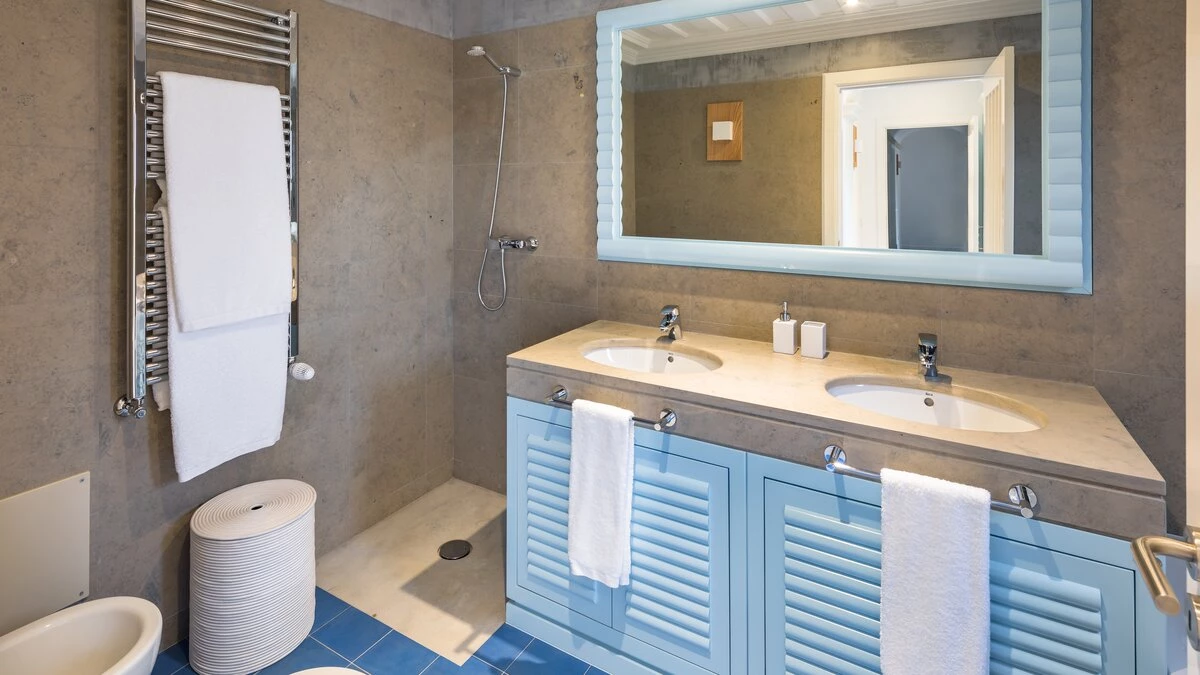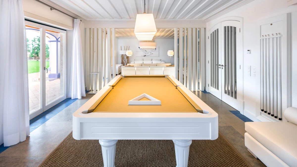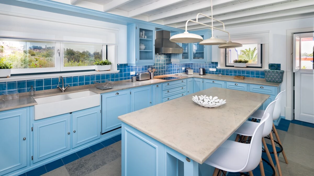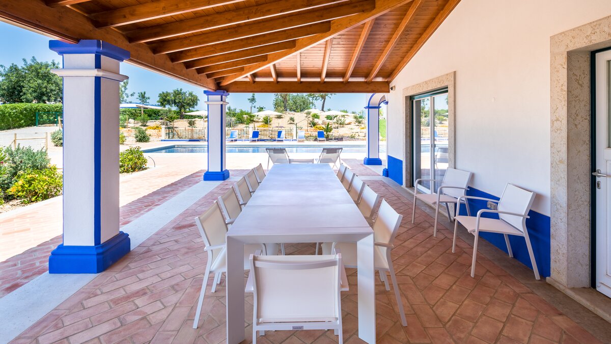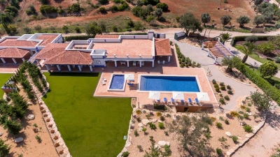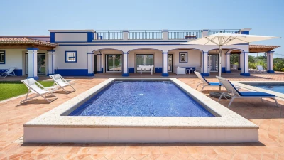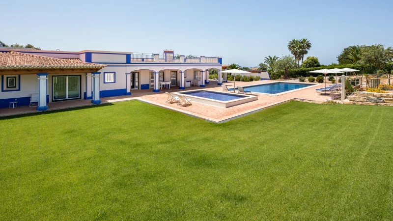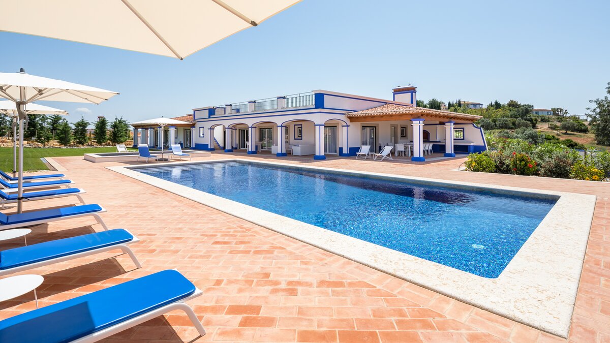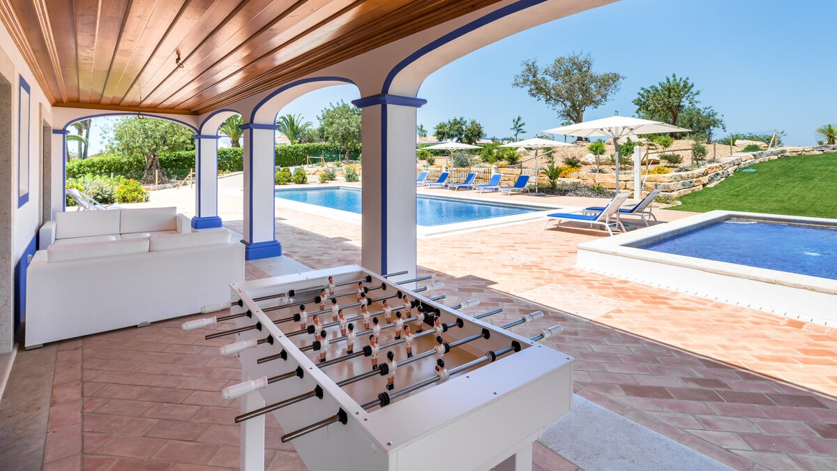 This recently built villa is an appealing mix of traditional architecture and contemporary interiors, in an enviable hilltop setting offering outstanding views over the countryside. A spacious and modern kitchen leads through to a semi-open plan living/dining area and games room with pool table, while sleeping quarters are comprised of three double bedrooms and a twin bedroom, all with bathrooms or shower rooms en suite. Interiors are decorated in a calming colour scheme of cool blues, whites and neutrals evoking thoughts of the seaside.The living space and several bedrooms open out to the shaded terrace, comfortably furnished for lounging and dining, which overlooks the flat lawned gardens bordered by gravel beds planted with trees and shrubs. The centrepiece of the garden is the large private pool sunk in the sunny patio, and the accompanying kids’ pool adjacent. Perfect for families with children, the little ones will also love the table football, table tennis and Playstation. The beaches of Vilamoura are 15km drive away, while Boliqueime is only 4km from the villa.