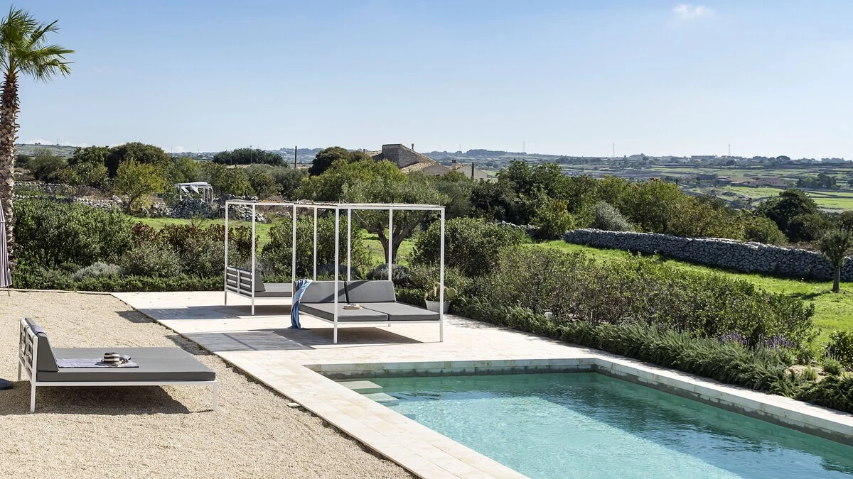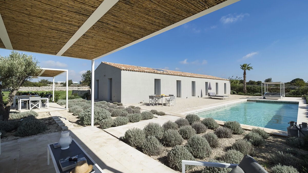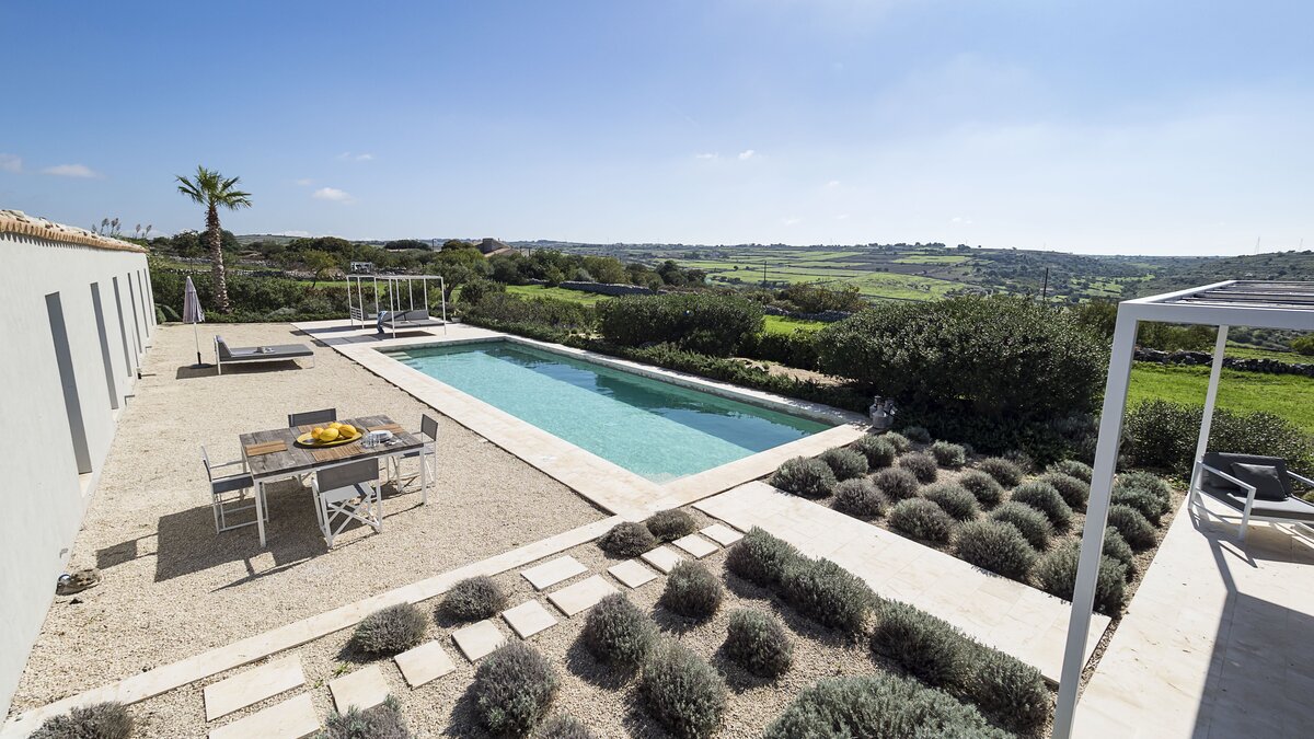 Set into the timeless pastoral countryside of rolling fields and dry stone walls between the beautiful Baroque town of Ragusa and the coast, this very comfortable modern property is furnished with taste and attention to detail with a mixture of modern design pieces and family pieces. A well-kept garden of approximately half an acre with aromatic and ornamental plants surrounding the pool and the villa with dining areas in both sun and shade.