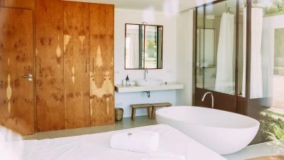 Outside are plenty of spaces to enjoy the sun. Guests can enjoy an al fresco supper at the dining table or lounge by the private pool. There is also a modern gym beneath the pool. Shops, restaurants and bars are just a short drive or stroll away, whilst there are also plenty of beaches within reach.