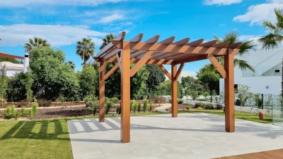 Outside, the beautifully landscaped garden surrounds an inviting heated pool where guests can enjoy refreshing swims while soaking up the sun. Comfortable sun loungers and shaded seating areas are thoughtfully arranged to offer idyllic spots for relaxation and leisure. An al fresco area, complete with a gas barbecue and outdoor sink, provides the perfect setting for creating memorable meals.