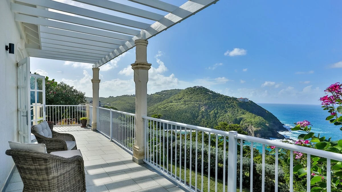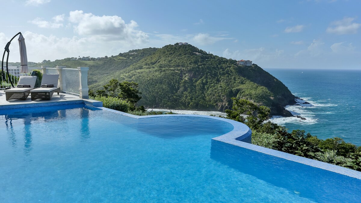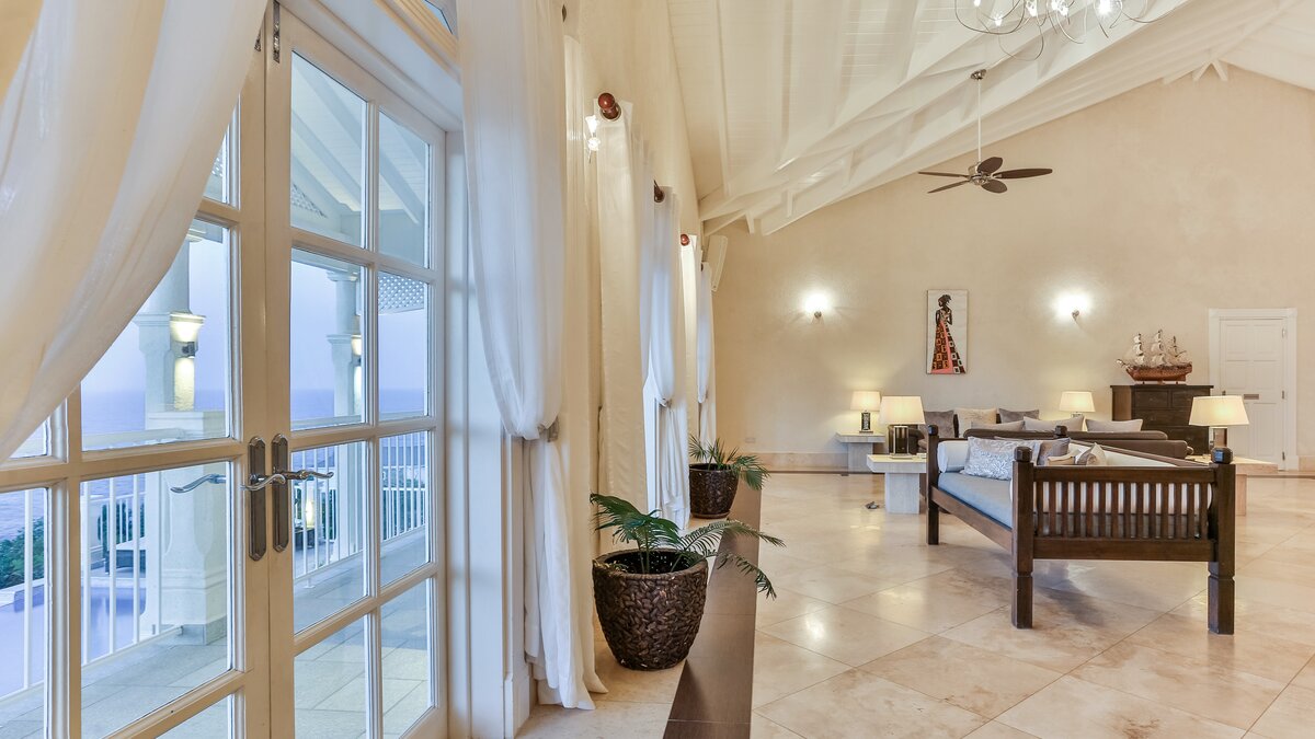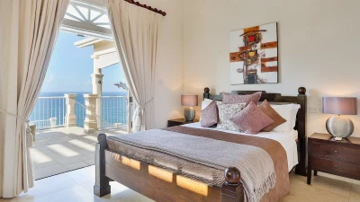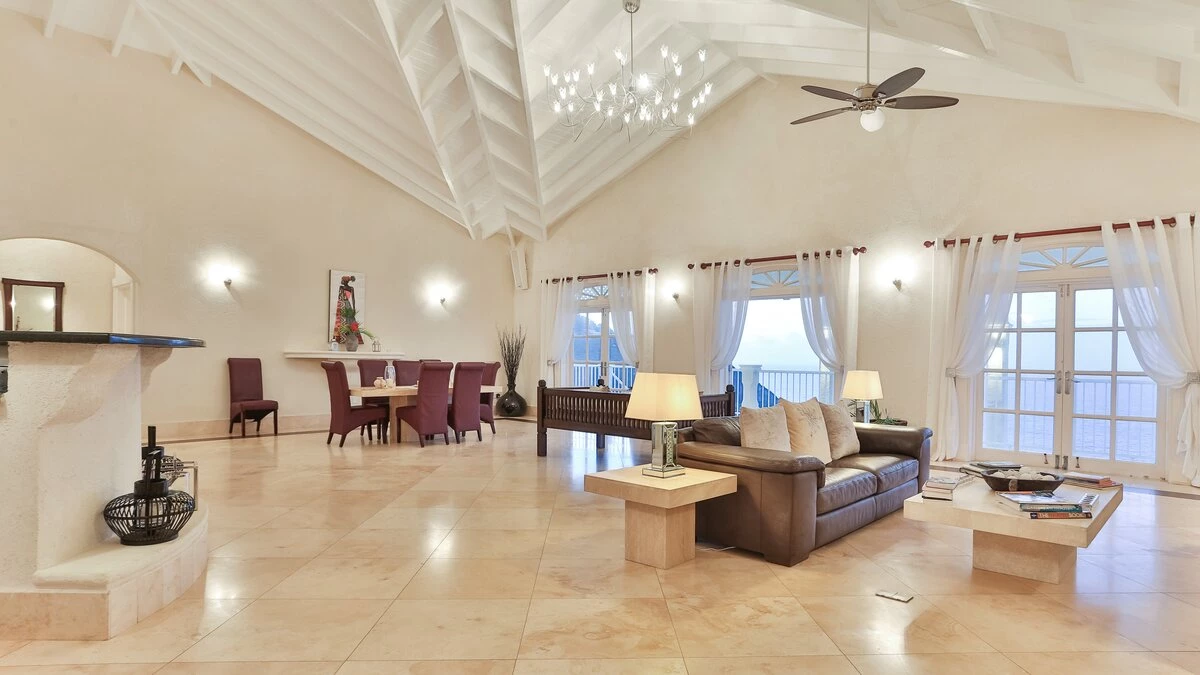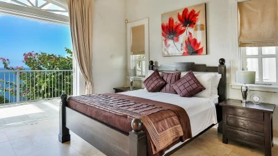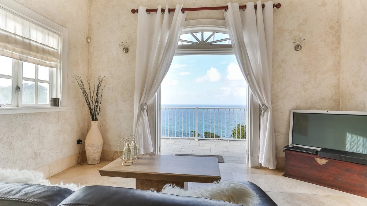 Inside the main villa, there is a tremendous open plan living and dining area. This space has heigh ceilings, bounds of natural light and a handful of french doors providing access to a terrace with views of the sea and Martinique, whilst just off to the side, there is a contemporary fully equipped kitchen. Furthermore, there are three bedrooms. One master with a king sized four poster bed, bathroom en suite and access to the balcony and two doubles, both with bathroom en suites.