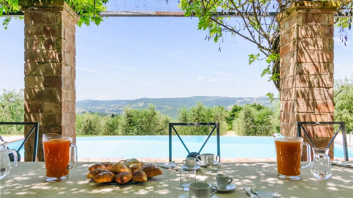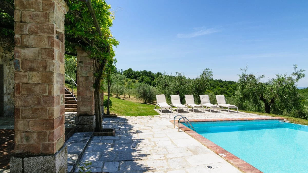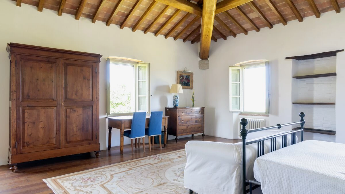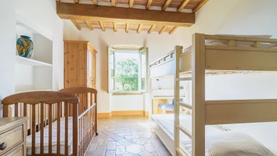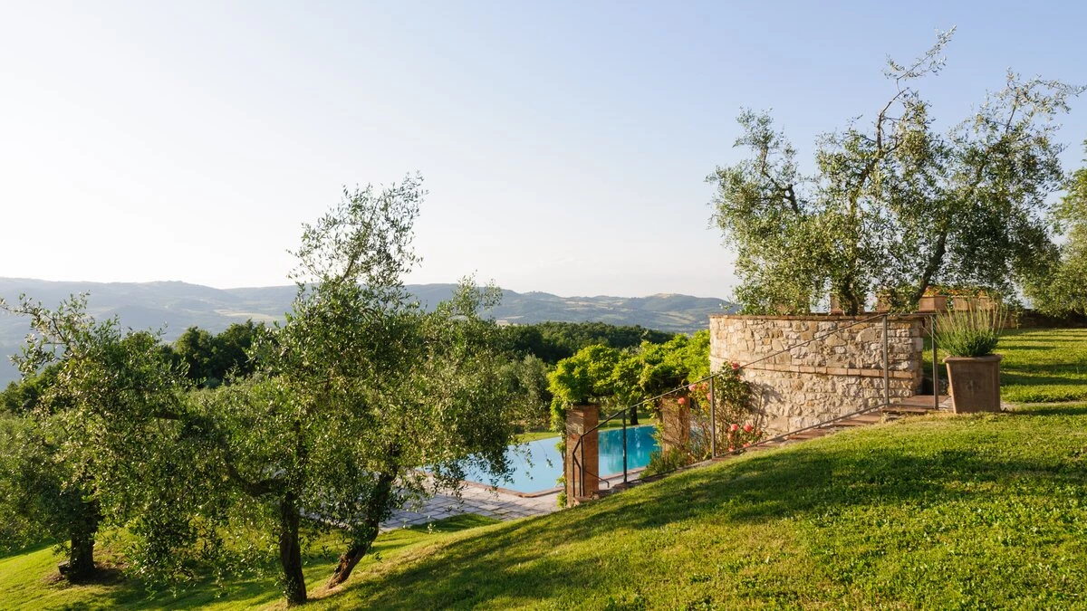 Even from the very traditional stone exterior, this house looks more ‘country villa’ than rambling farmstead, but still the light and spacious interiors come as some surprise. The old world meets the new in a long living room, with its ribbed terracotta ceiling over crisp white walls and large modern sofas, a big stone fireplace at one end and the clean lines of a modern dining suite at the other. There are all mod cons under the raftered kitchen roof, the study is equipped with WiFi and iPod dock, and bedrooms are uncluttered and understated. Outside, a long marble table makes the broad terrace a perfect spot for candlelit dining on balmy evenings, and twin staircases at either end lead down to the infinity pool, where a large pool house, with its own kitchenette, serves a wisteria-draped terrace furnished for al fresco lunches. The four-acre grounds encompass silvered olive groves and slope gently down to a tennis court (shared with sister-villa Casa Andrea). Cook service could be an added indulgence here, and there is an excellent restaurant a very short drive away. The very tranquil setting is just 8km from shops and restaurants in beautiful Todi, its skyline visible from the villa grounds.