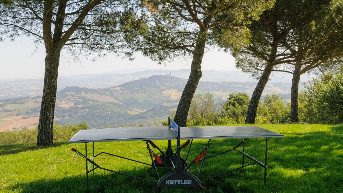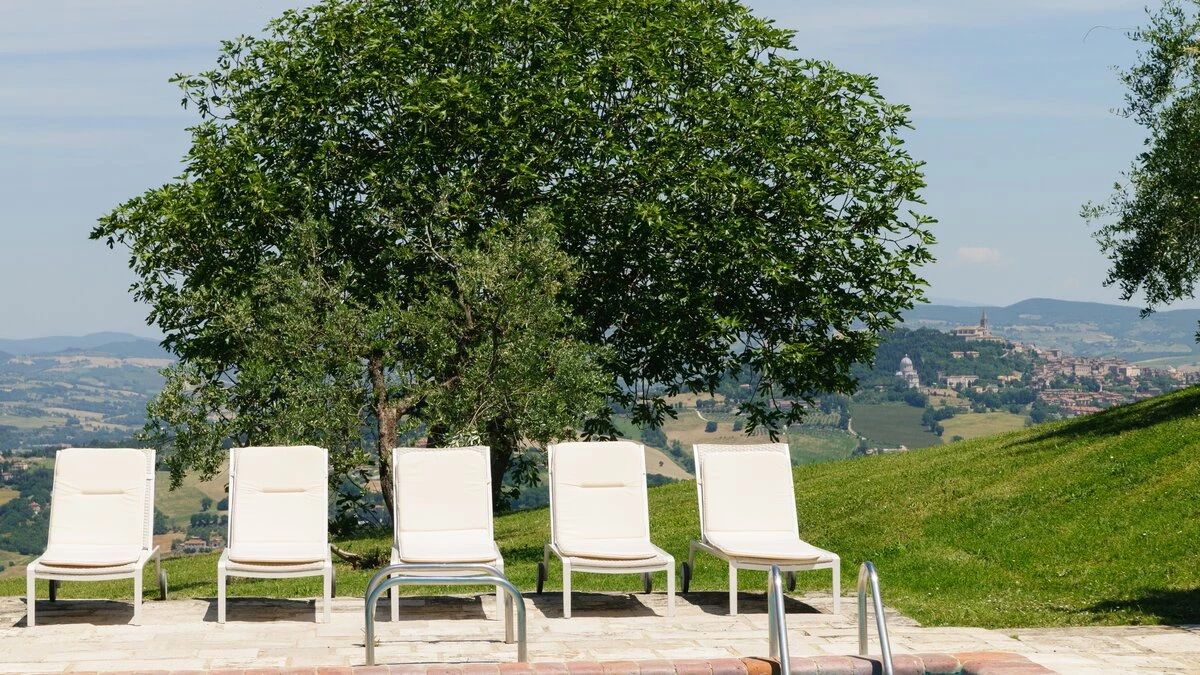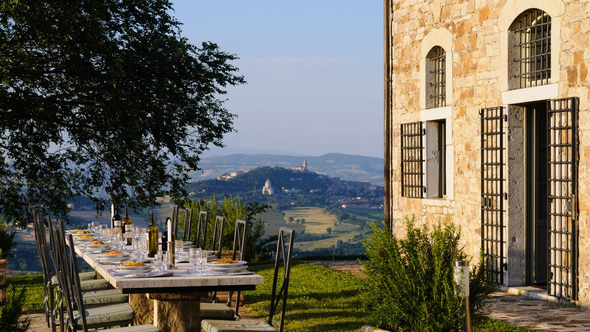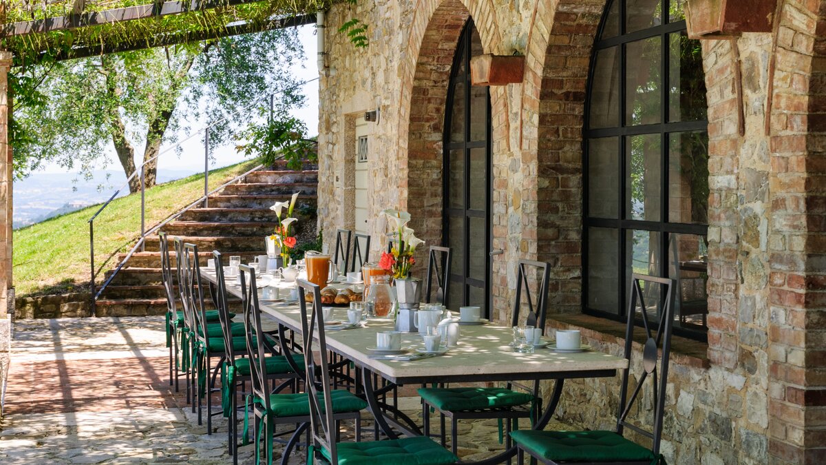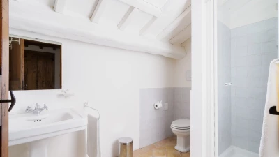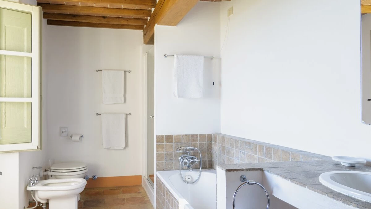 Even from the very traditional stone exterior, this house looks more ‘country villa’ than rambling farmstead, but still the light and spacious interiors come as some surprise. The old world meets the new in a long living room, with its ribbed terracotta ceiling over crisp white walls and large modern sofas, a big stone fireplace at one end and the clean lines of a modern dining suite at the other. There are all mod cons under the raftered kitchen roof, the study is equipped with WiFi and iPod dock, and bedrooms are uncluttered and understated. Outside, a long marble table makes the broad terrace a perfect spot for candlelit dining on balmy evenings, and twin staircases at either end lead down to the infinity pool, where a large pool house, with its own kitchenette, serves a wisteria-draped terrace furnished for al fresco lunches. The four-acre grounds encompass silvered olive groves and slope gently down to a tennis court (shared with sister-villa Casa Andrea). Cook service could be an added indulgence here, and there is an excellent restaurant a very short drive away. The very tranquil setting is just 8km from shops and restaurants in beautiful Todi, its skyline visible from the villa grounds.