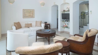Inside, the villa features an open-plan living and dining area on the ground floor, with French doors opening onto a patio, plunge pool, and garden. The two bedrooms on the first floor each have an en suite bathroom and balcony, offering garden and beach views. The master suite takes up the entirety of the second floor, boasting a spacious sitting area, en suite bathroom, and walk-in dressing room, alongside gracious sea views from the balcony. In the kitchen, guests can prepare their own meals, and for those who prefer to indulge in local flavours without the fuss, the in-villa chef can cook up two delicious meals each day, tailored to your personal preferences.