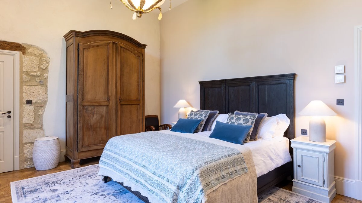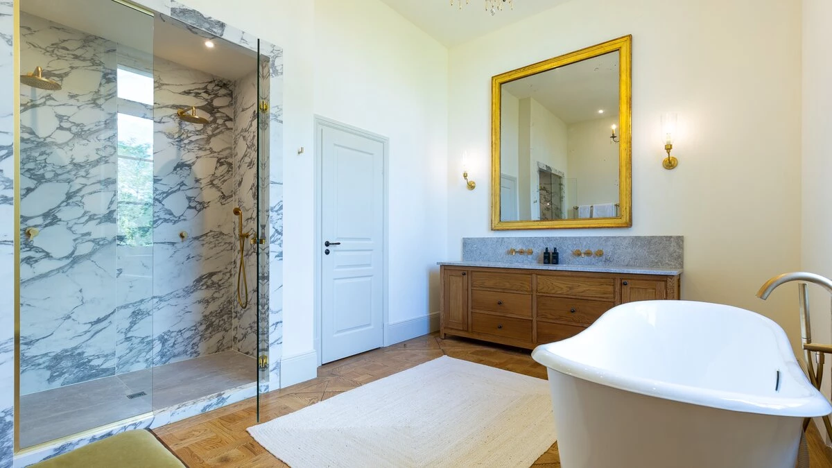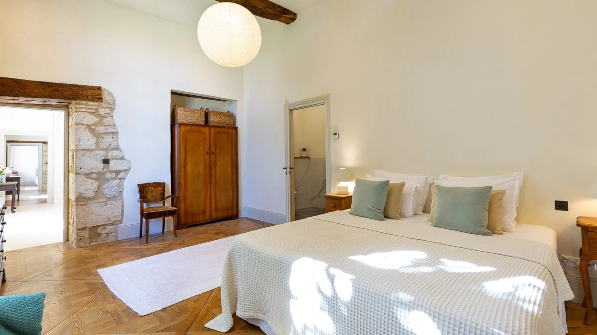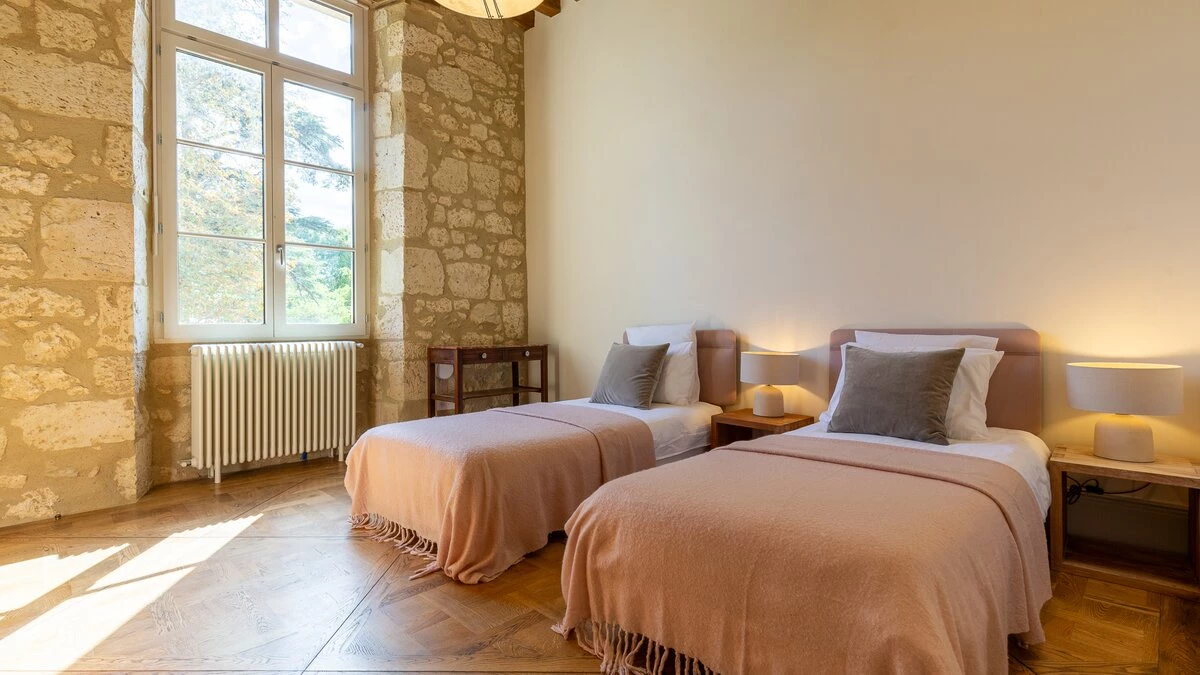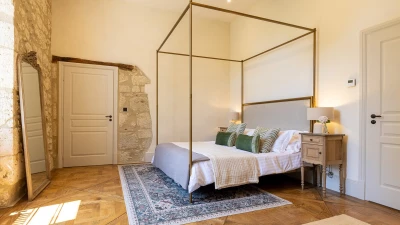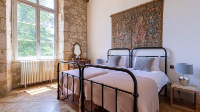 Ascending the grand staircase, guests will find six beautifully appointed bedrooms on the first floor of the main chateau. Each bedroom is generously sized, with soaring 3.5 metre high ceilings and its own luxurious bathroom, ensuring comfort and privacy for up to fourteen guests. The thoughtful restoration preserves the chateau’s historic charm while providing all the modern comforts.