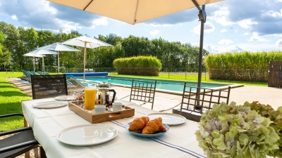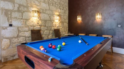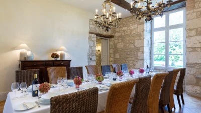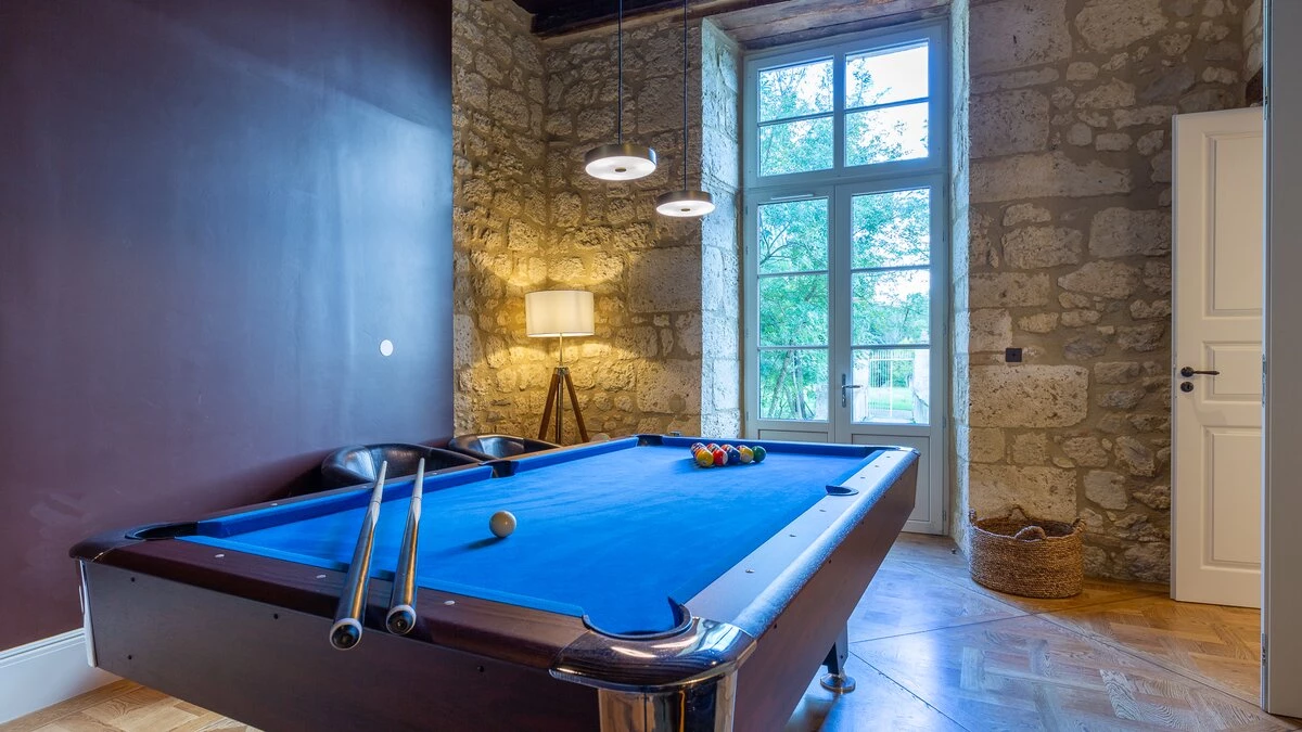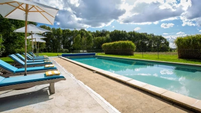Outside, guests can enjoy the graceful courtyard, encircled by the chateau’s moat, which is ideal for al fresco dining under the shade of mature trees or enjoying a friendly game of pétanque. The heated swimming pool is a highlight, complete with a covered seating area and convenient poolside facilities. The estate’s vast grounds invite leisurely strolls through private gardens, meadows, and woods, offering guests both seclusion and opportunities for outdoor adventure.