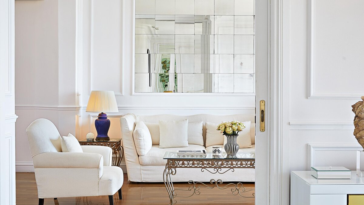 As guests enter the suite, they are greeted by the open plan living and dining area. This room is full of soft, white furnishings and original features creating a feeling of minimalism and a space full of charm. A shared balcony is just a few footsteps away and provides panoramic views of the Mediterranean sea and natural light back into the suite. On the same floor, through grand sliding doors, there is a master bedroom. This room has a bathroom en suite and shared balcony with sea views; and holds the same style of design as the rest of the suite, clean and crisp. An additional double bedroom with shower room en suite is also close by.