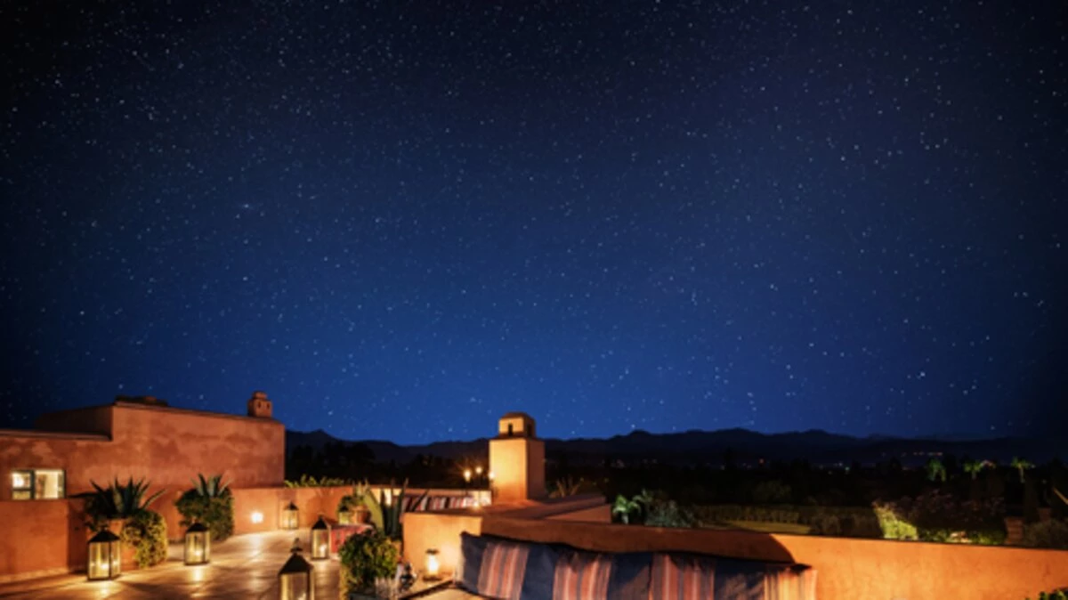 Set over three floors, in two acres of beautifully landscaped gardens, this property is a beautiful combination of Moroccan authenticity and modern luxury. With plenty of shady terraces, green lawns and poolside loungers, you’re sure to find a favourite spot to relax. The roof terrace, with panoramic views of the Atlas Mountains, is the perfect location for sundowners and stargazing after a cooling dip in the large private pool. On the ground floor there is a spacious but cosy open plan living area with fireplace, and French doors opening out to the terrace and gardens. Three of the four ensuite bedrooms are also situated on the ground floor with access to the gardens or terraces.