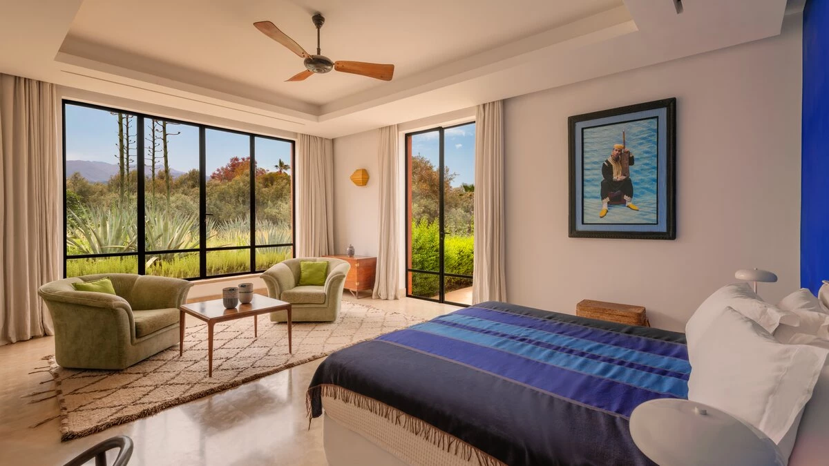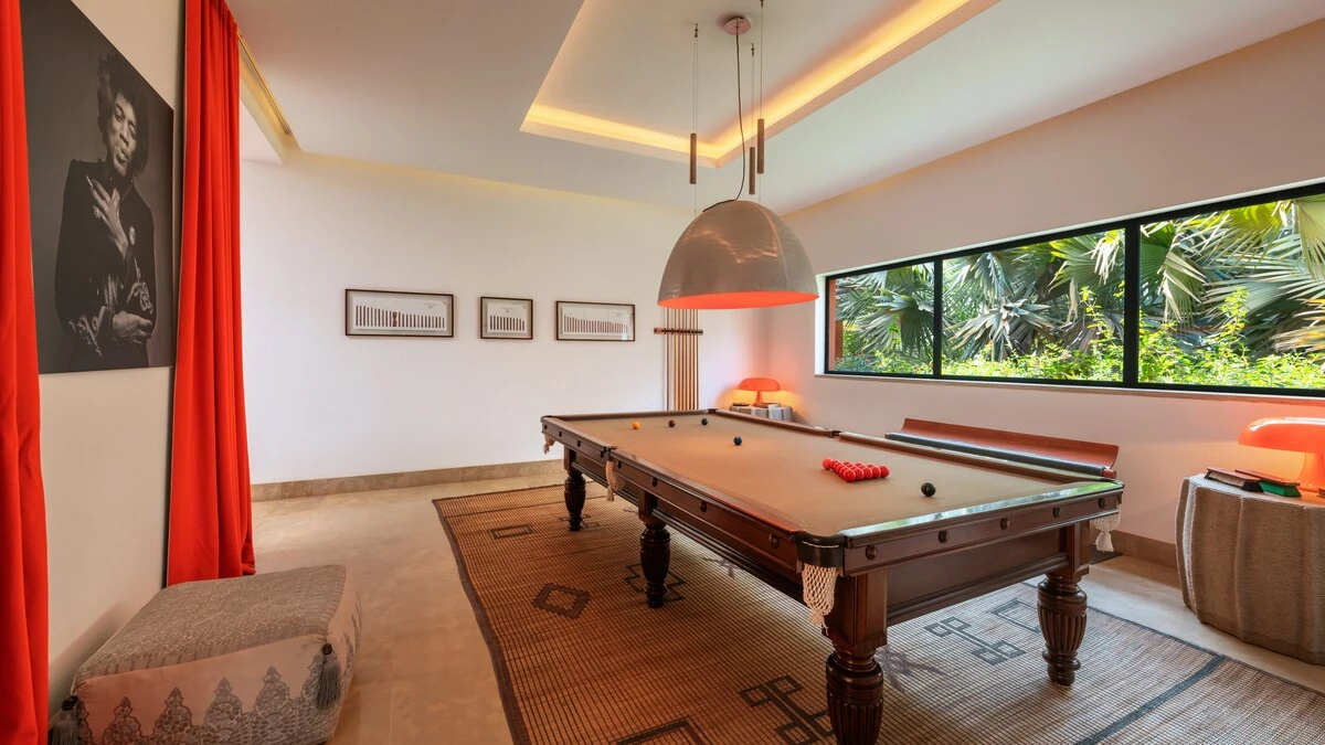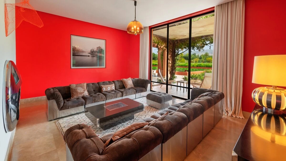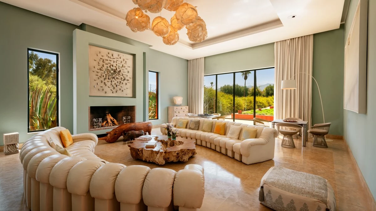 The main house features four spacious bedrooms, alongside refined living and dining areas, a billiards room, cinema room, and a serene spa complete with hammam and massage facilities. Seven additional one-bedroom villas are dotted throughout the gardens, each designed with striking architecture and contemporary comforts.