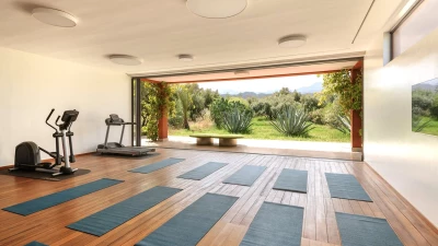 At the heart of the estate lies a magnificent 18-metre-long swimming pool, framed by stone terraces and complemented by a pool house with pool kitchen,  changing rooms, outdoor bar, and dining area. Leisure facilities include a clay tennis court, pétanque, and a fitness space suitable for yoga.