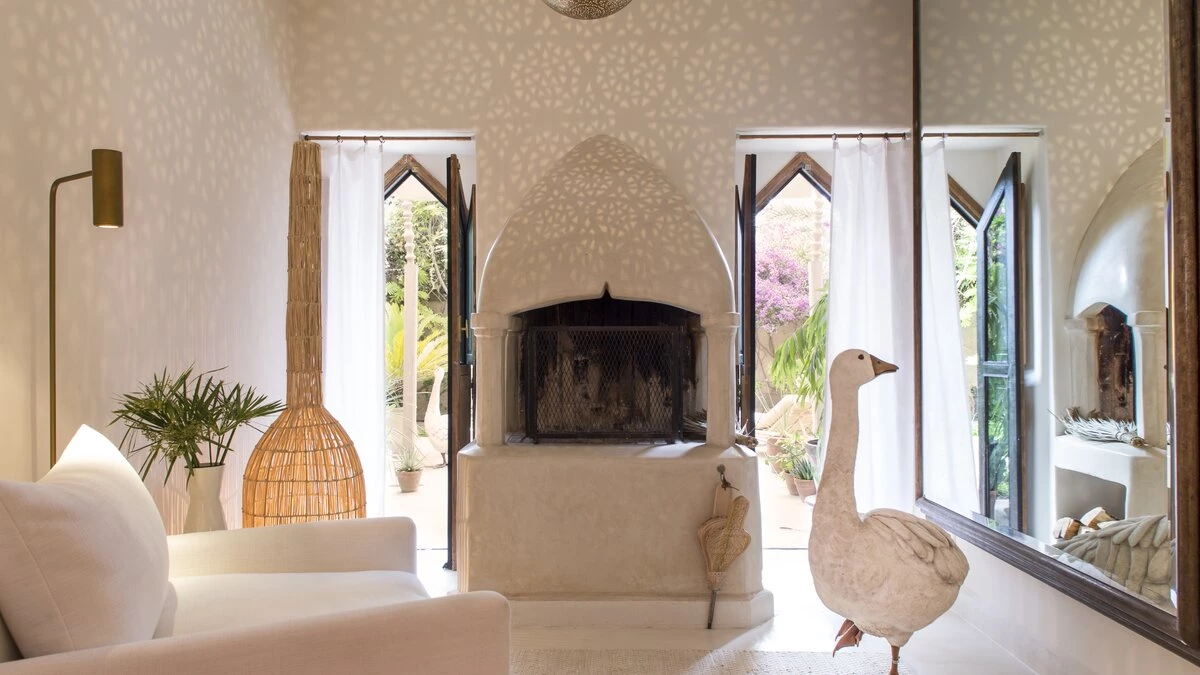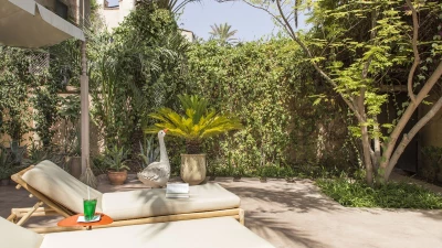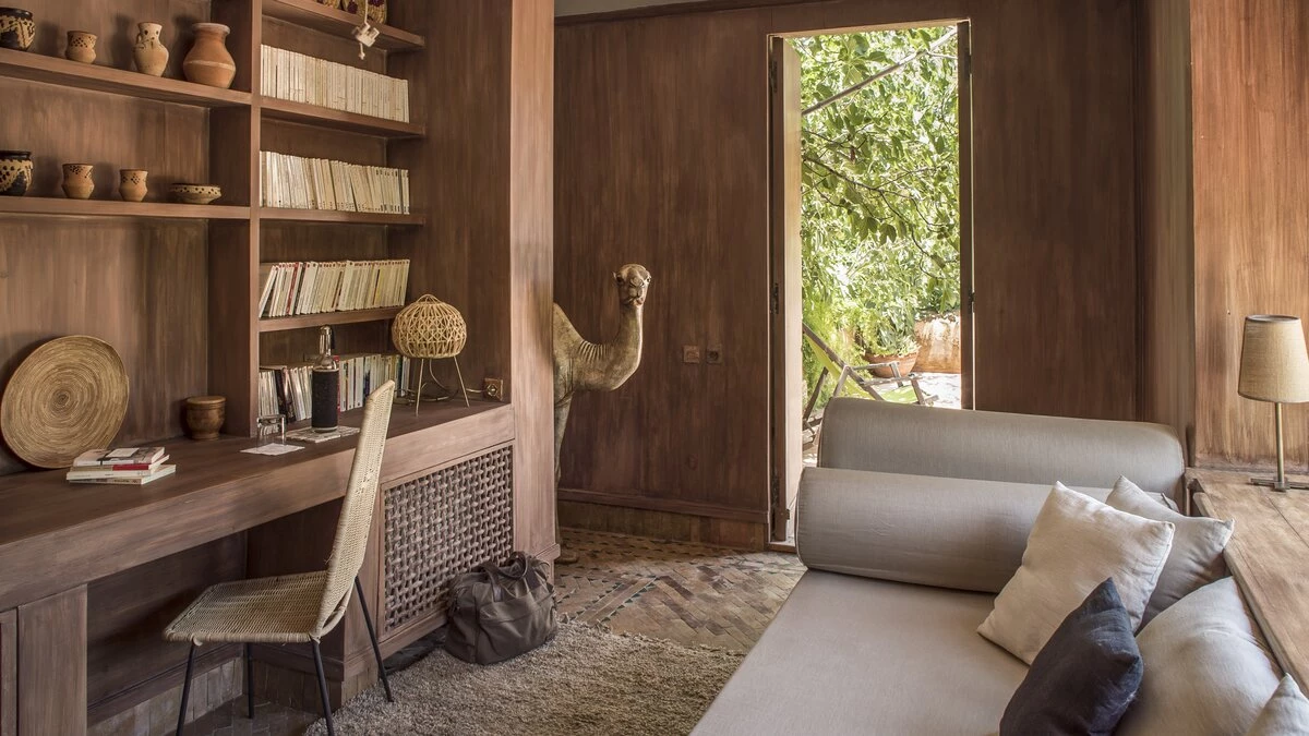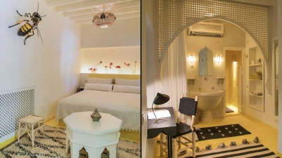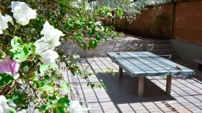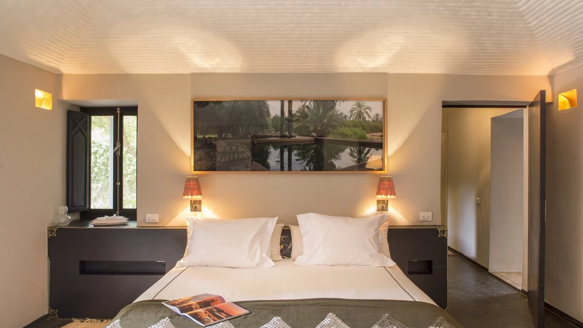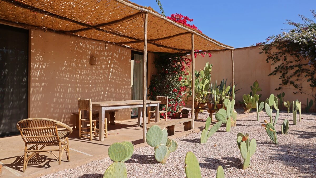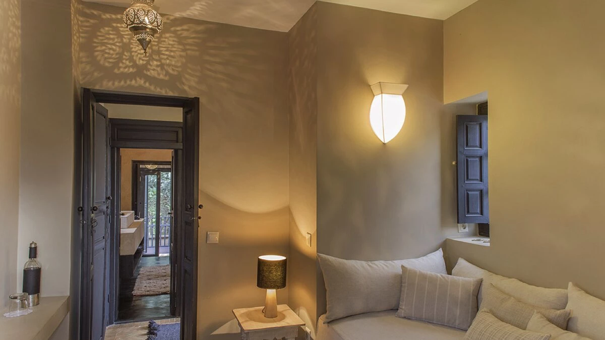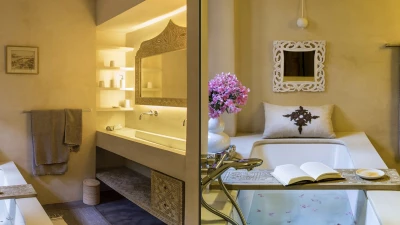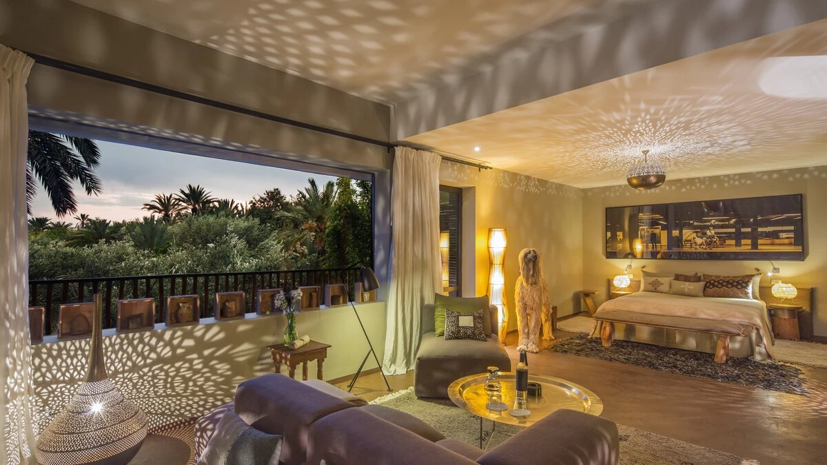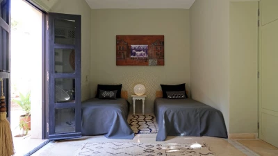 The additional Riad Suite can be rented alongside the main villa to sleep up to four more guests. This annexe includes a double and twin bedroom, a lovely patio with a covered sitting area, and a terrace with a cactus garden. This exceptional property is just as spacious and unique outside, with a lovely large pool and lush gardens. The villa is fully-staffed for an indulgent and luxurious escape just 8.9km from the vibrant centre of Marrakech.