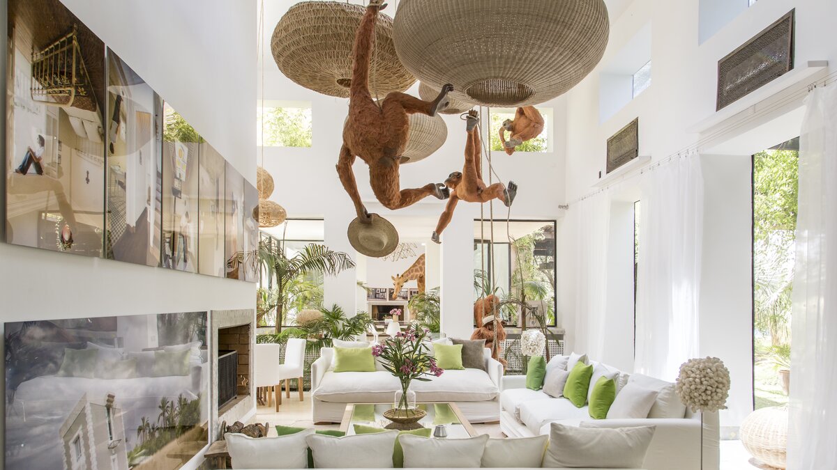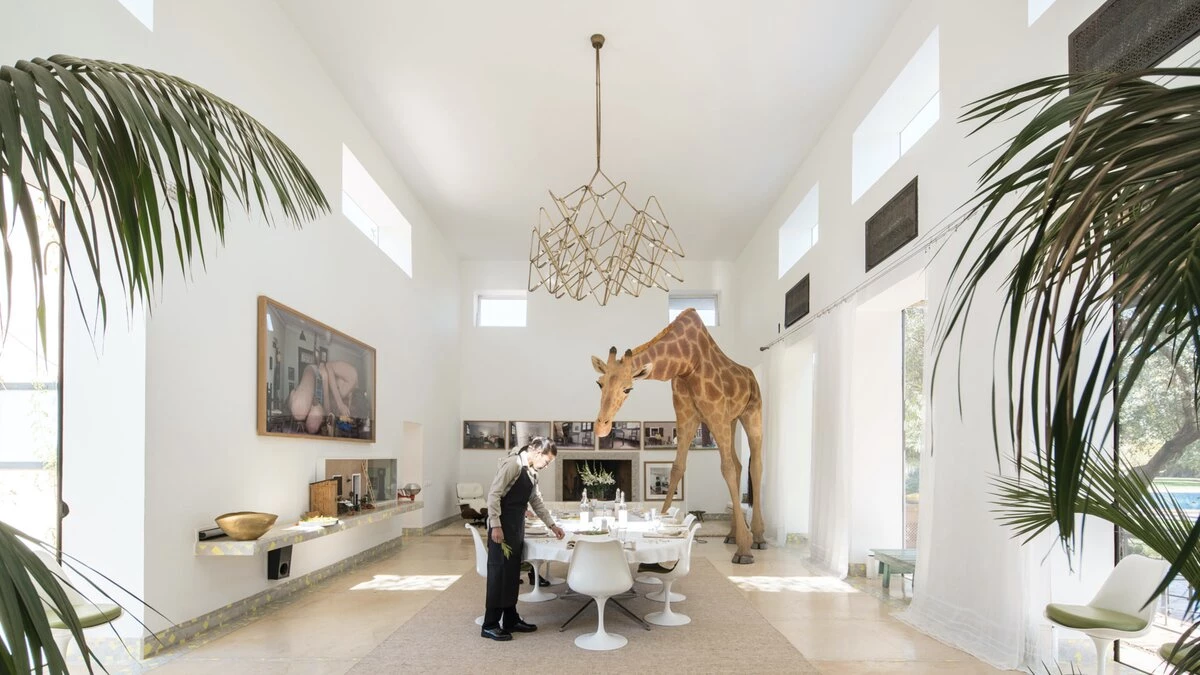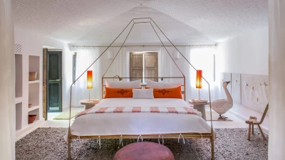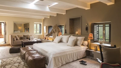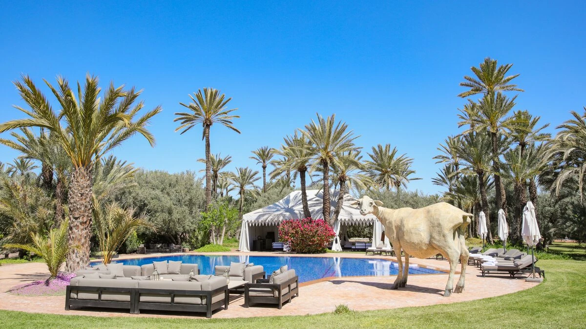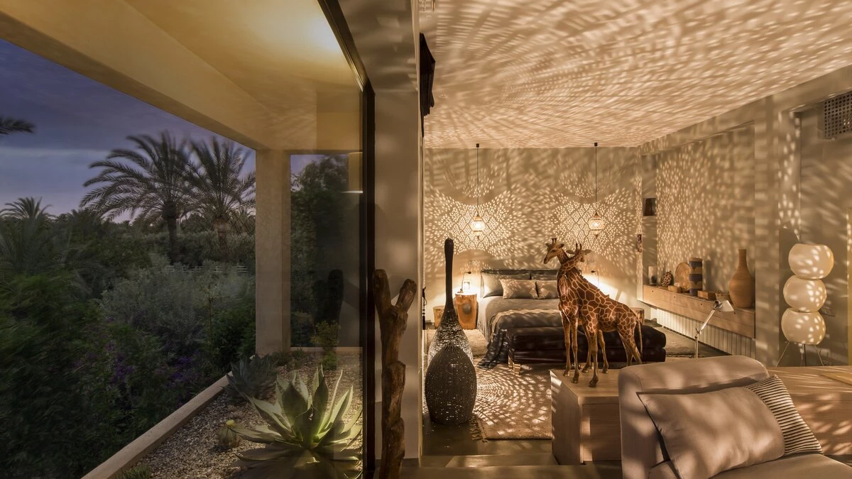 Part of our high-spec ABOVE collection, Dar El Sadaka is an exceptional villa designed for large groups of family and friends. Created by French visual artist Jean-François Fourtou, this unique property features fascinating artwork and nine individually-themed suites and bedrooms. Nestled in a twenty-five acre private area in the palmeraie of Marrakech, Dar El Sadaka truly offers a holiday to remember. On the ground floor, guests will discover a spacious and stylish living room, dining room, library and home cinema, as well as a hammam and spa treatment area. There are also four double-bed suites here, each with wonderfully unique features including a plunge bath in the Tortoises Suite, a dressing room in the Donkey Suite, a circular plunge bath and lounge in the Geese Suite, and a rain shower in the Bee Bedroom. Head upstairs to discover four more en suite bedrooms. The lovely Dog Suite is designed with access to both a terrace and balcony, while the Camels Suite has a plunge bath for two and an annexe with a single bed. The bright and airy Ant Junior Suite features a skylight and an annexe with a single bed, whilst the Snails Bedroom includes a fireplace and a rain shower. The spacious Giraffe Suite can be found on the second floor, complete with a super-king size bed, a workspace, sitting room with a wood stove, hanging cactus garden, rain shower and an outdoor freestanding bathtub to enjoy under the stars.