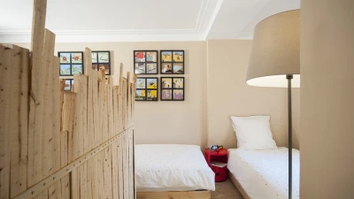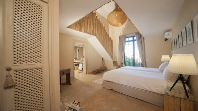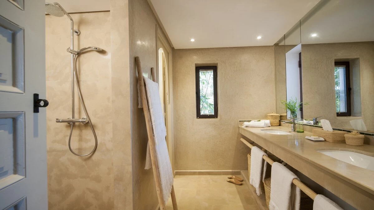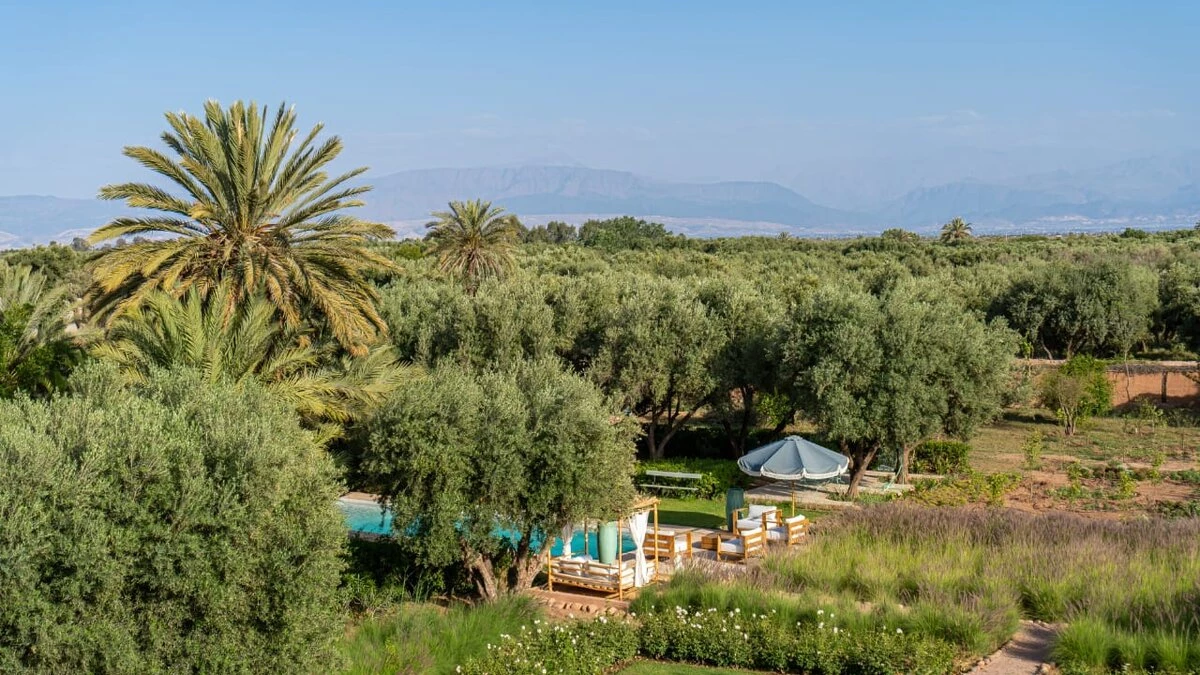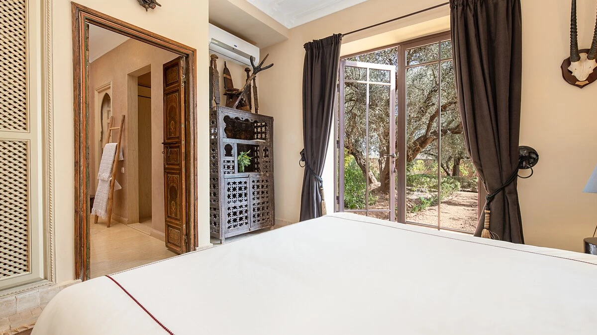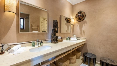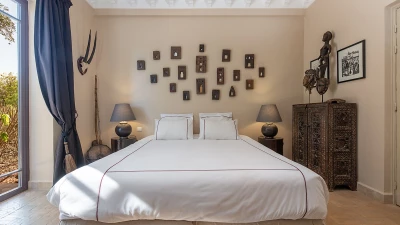 The modern, individually decorated interiors contrast flawlessly with classic Moroccan touches. With cool neutrals, crisp whites, elegant fittings, this villa is richly furnished in contemporary facilities with many unique decorative pieces and works of art from the young owner's travels worldwide. The contemporary open-plan living and dining space with high ceilings, connects to the large kitchen that opens to the al fresco dining terrace. The cook, with assistance from the team of villa staff, serves breakfast, lunch and dinner daily. There are two double bedrooms suites on the ground floor, which can be made up as twins, each with have shower rooms en suite and open up to the extensive gardens. A third bedroom on the ground floor has a mezzanine level with five extra beds. The master double bedroom is located upstairs, with an en suite bathroom and a private terrace with sun loungers to worship the sun and stargaze at night with views towards the Atlas Mountains. A double bedroom with private shower and a further private balcony completes the first floor. All bedrooms can be made up as double or twin bedrooms. Activities include a petanque court, badminton, football and yoga mats.