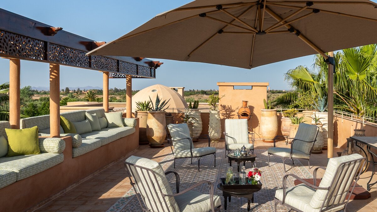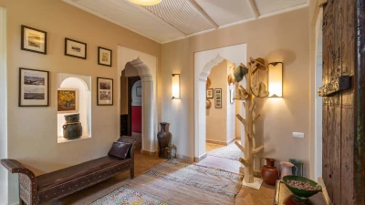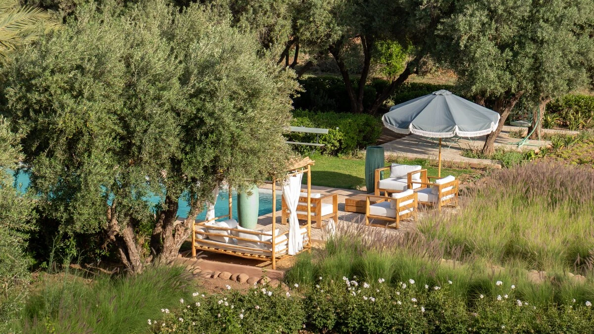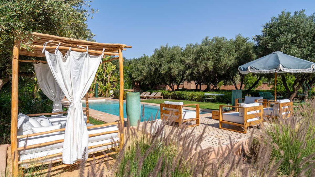 Dar Toozween is a very attractive two-storey south facing villa, within a short drive away from the centre of Marrakech. Perfectly planned for outdoor living, the villa is set in one hectare of mature landscaped gardens with roses, polemo trees and rosemary hedges, olive trees, elegantly furnished terraces and a large private heatable pool with adjacent dining area and pool house.