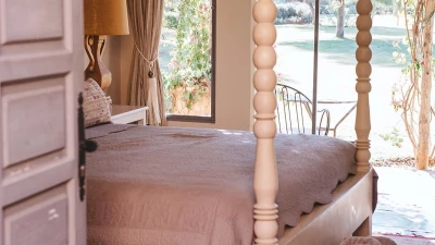A very chic and contemporary villa, furnished throughout in cool neutrals, this beautiful house has flagstone floors, four-poster bedrooms, fabulous bathrooms, and a feast of carefully chosen objets d’art. Within the air-conditioned villa, every room opens out to a terrace overlooking the grounds, one shaded and furnished for al fresco dining, another, a roof terrace, perfect for stargazing. There’s a little coffee/breakfast area in the stylish kitchen; the sitting room is elegantly furnished with big sofas and adjoins an equally inviting dining room, each with an open fireplace for cooler evenings; and there are four bedrooms on the ground floor, the luxurious master bedroom enjoying extra privacy on the upper level. Outside, a large swimming pool and poolside pergola form a focal point in manicured gardens of lawns, roses and citrus trees. And the house is served by dedicated staff, the talented cook preparing breakfast and other meals daily. Concierge services are offered on the estate, along with a tennis court, golf and fitness room, and Marrakech is within easy reach for souks and the very best restaurants and stylish shopping and we also recommend a day of walking, lunch and carpet shopping in the Atlas mountains.